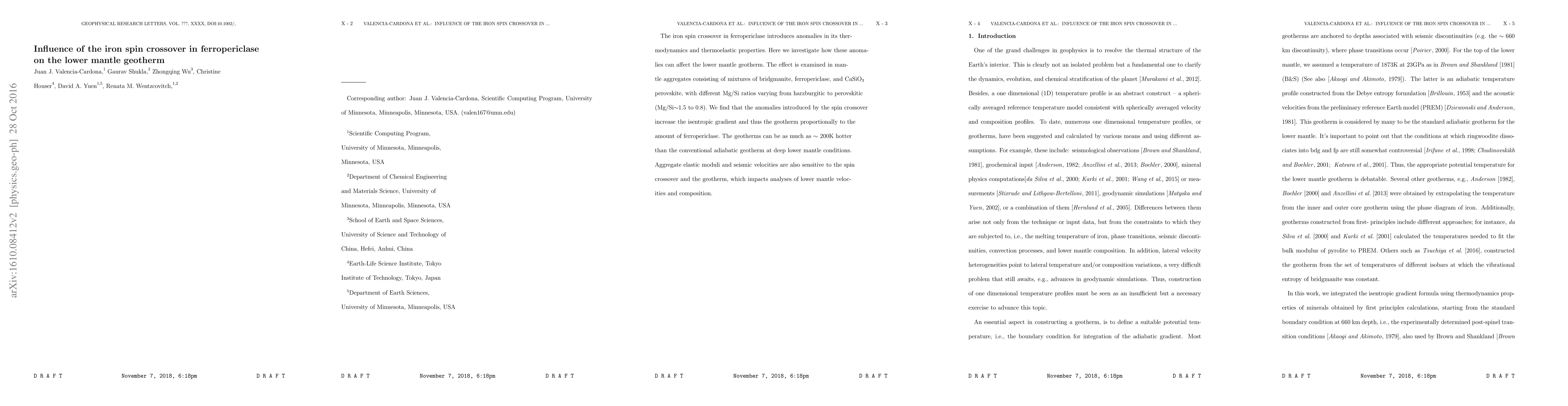 This study investigates how iron spin crossover in ferropericlase affects the lower mantle geotherm, finding that it increases the isentropic gradient and makes the geotherm up to 200K hotter than conventional models, while also influencing seismic velocities and composition analyses.