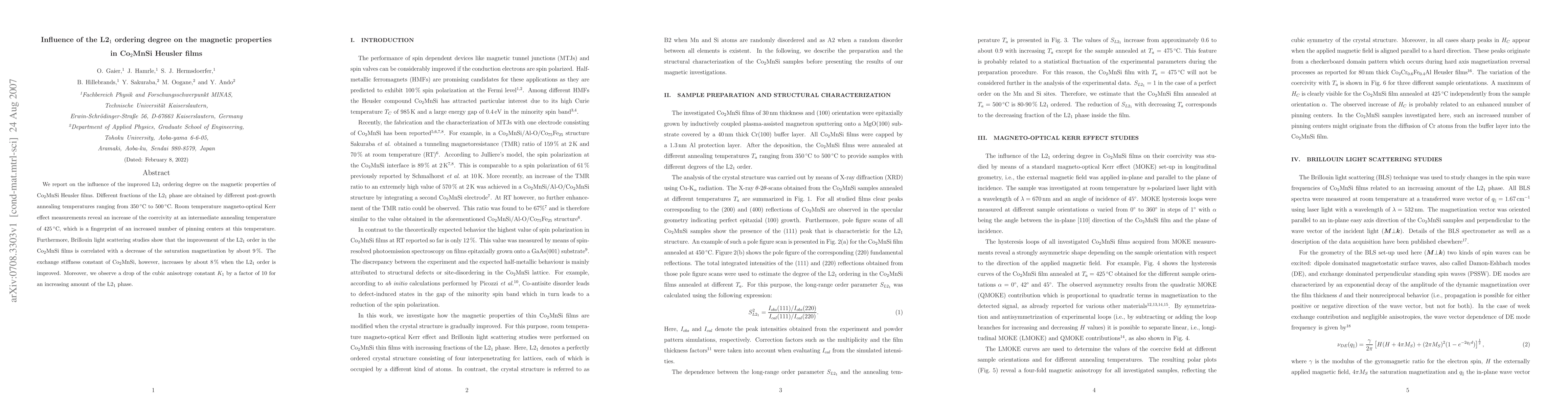 We report on the influence of the improved L21 ordering degree on the magnetic properties of Co2MnSi Heusler films. Different fractions of the L21 phase are obtained by different post-growth annealing temperatures ranging from 350 degC to 500 degC. Room temperature magneto-optical Kerr effect measurements reveal an increase of the coercivity at an intermediate annealing temperature of 425 degC, which is a fingerprint of an increased number of pinning centers at this temperature. Furthermore, Brillouin light scattering studies show that the improvement of the L21 order in the Co2MnSi films is correlated with a decrease of the saturation magnetization by about 9%. The exchange stiffness constant of Co2MnSi, however, increases by about 8% when the L21 order is improved. Moreover, we observe a drop of the cubic anisotropy constant K1 by a factor of 10 for an increasing amount of the L21 phase.