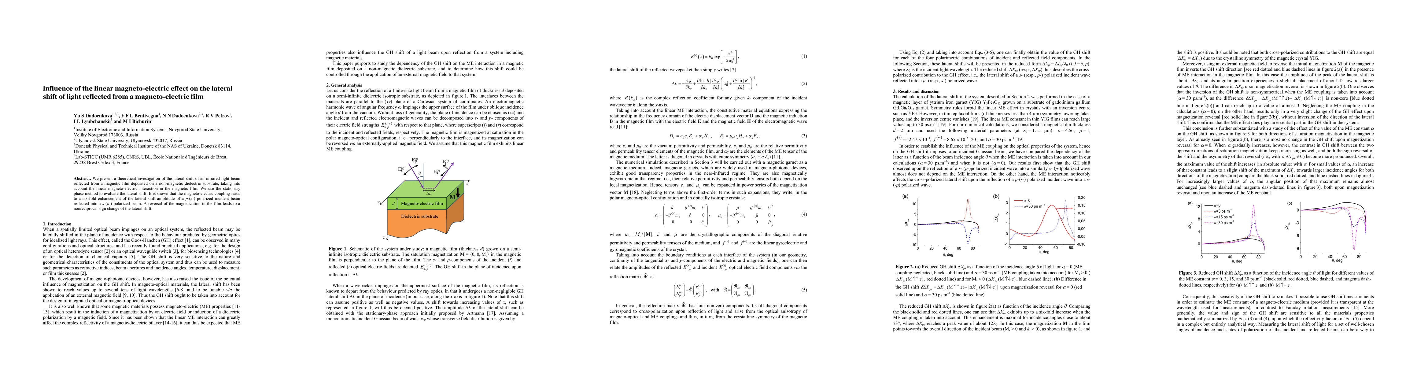 This paper investigates the lateral shift of infrared light reflected from a magneto-electric film, revealing a six-fold enhancement due to linear magneto-electric effects. The study demonstrates a nonreciprocal sign change in the lateral shift upon reversing the film's magnetization.