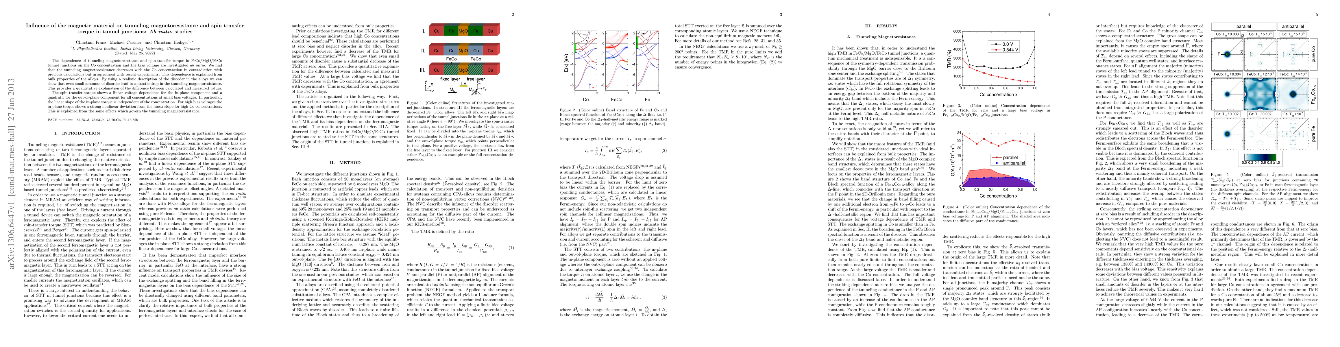 This study investigates the impact of cobalt concentration and bias voltage on tunneling magnetoresistance and spin-transfer torque in FeCo/MgO/FeCo tunnel junctions using ab initio methods. The research reveals a decrease in tunneling magnetoresistance with increasing Co concentration, aligning with recent experiments but contradicting previous calculations, and attributes this to alloy disorder effects. Spin-transfer torque shows linear and quadratic voltage dependencies for in-plane and out-of-plane components, respectively, with nonlinear deviations at high Co concentrations.