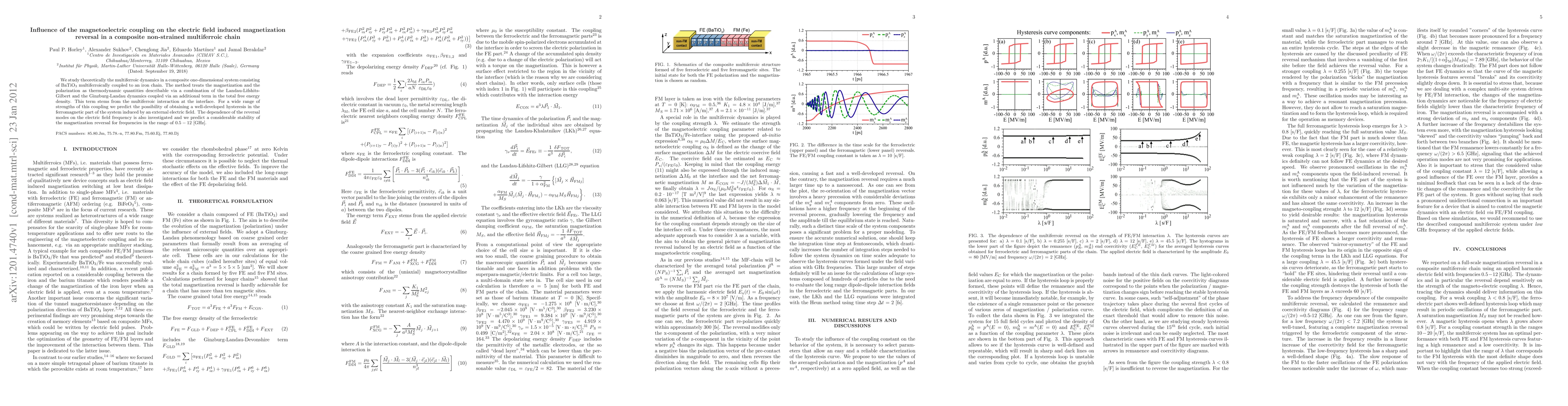 This paper theoretically investigates the magnetoelectric coupling in a composite one-dimensional multiferroic chain of BaTiO3 and iron, predicting hysteresis in the magnetization induced by an external electric field. The study also finds stable magnetization reversal for electric field frequencies between 0.5 - 12 GHz.