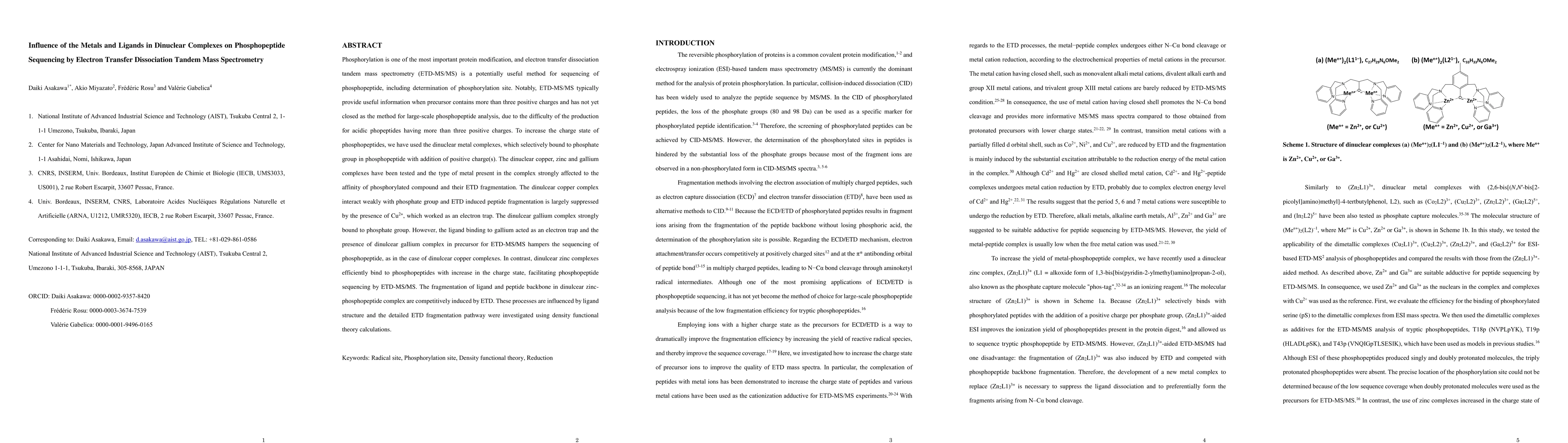 Phosphorylation is one of the most important protein modifications, and electron-transfer dissociation tandem mass spectrometry (ETD-MS/MS) is a potentially useful method for the sequencing of phosphopeptides, including determination of the phosphorylation site. Notably, ETD-MS/MS typically provides useful information when the precursor contains more than three positive charges. It is not yet used as an analysis method for large-scale phosphopeptide production due to difficulties occurring in the production of acidic phosphopeptides having more than three positive charges. To increase the charge state of phosphopeptides, we used dinuclear metal complexes, which selectively bind to the phosphate group in phosphopeptides with the addition of positive charge(s). Dinuclear copper, zinc, and gallium complexes were tested and it was found that the type of metal present in the complex strongly affected the affinity of the phosphorylated compounds and their ETD fragmentation. The dinuclear copper complex interacted weakly with the phosphate groups and ETD-induced peptide fragmentation was largely suppressed by the presence of Cu2+, which worked as an electron trap. The dinuclear gallium complex was strongly bound to a phosphate group. However, the ligand binding to gallium acted as an electron trap and the presence of dinuclear gallium complex in the precursor for ETD-MS/MS hampered the sequencing of the phosphopeptides, as in the case of dinuclear copper complexes. In contrast, dinuclear zinc complexes efficiently bind to phosphopeptides with an increase in the charge state, facilitating phosphopeptide sequencing by ETD-MS/MS. The fragmentation of the ligand and peptide backbone in the dinuclear zinc--phosphopeptide complex were competitively induced by ETD. These processes are influenced by the ligand structure and so the detailed ETD fragmentation pathways were investigated using density functional theory calculations.