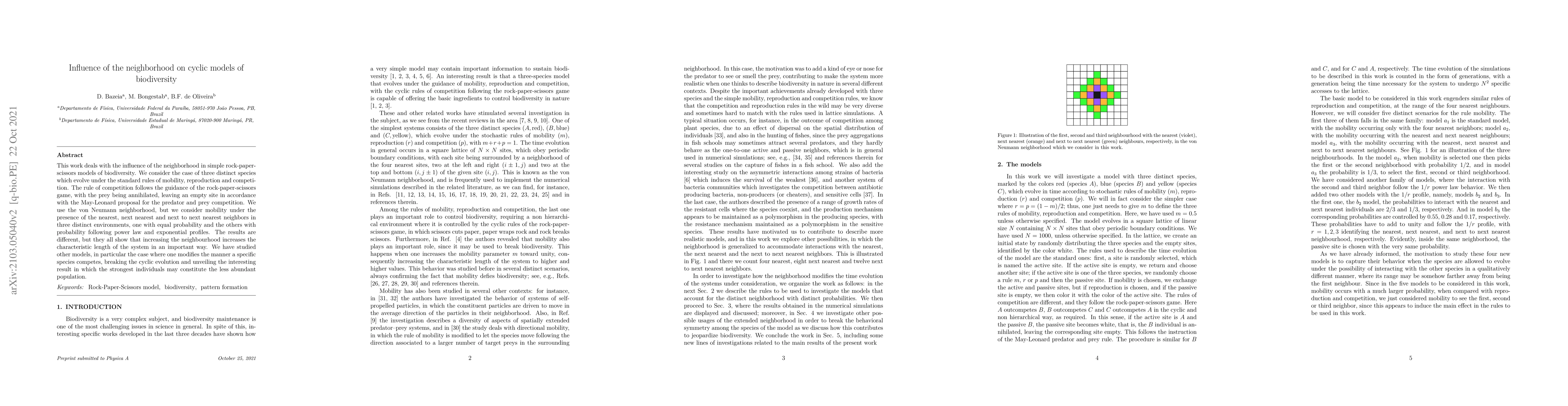 This work deals with the influence of the neighborhood in simple rock-paper-scissors models of biodiversity. We consider the case of three distinct species which evolve under the standard rules of mobility, reproduction and competition. The rule of competition follows the guidance of the rock-paper-scissors game, with the prey being annihilated, leaving an empty site in accordance with the May-Leonard proposal for the predator and prey competition. We use the von Neumann neighborhood, but we consider mobility under the presence of the first, second and third neighbors in three distinct environments, one with equal probability and the others with probability following the power law and exponential profiles. The results are different, but they all show that increasing the neighbourhood increases the characteristic length of the system in an important way. We have studied other possibilities, in particular the case where one modifies the manner a specific species competes, unveiling the interesting result in which the strongest individuals may constitute the less abundant population.