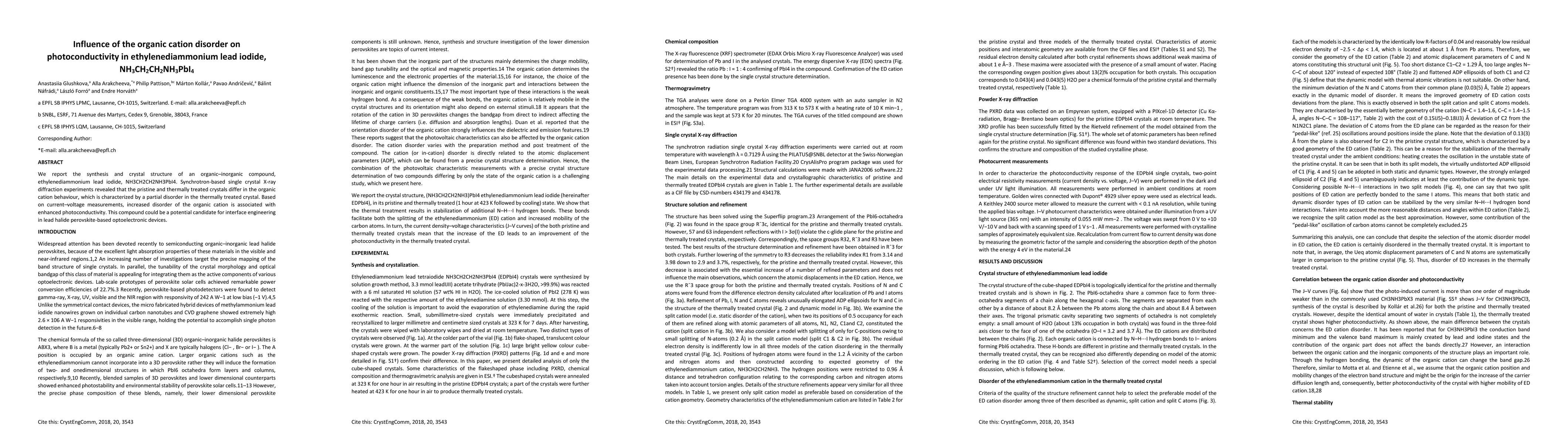 This study investigates the impact of organic cation disorder on photoconductivity in ethylenediammonium lead iodide, finding that thermal treatment induces partial disorder, which enhances photoconductivity. The compound shows promise for interface engineering in lead halide perovskite optoelectronic devices.
