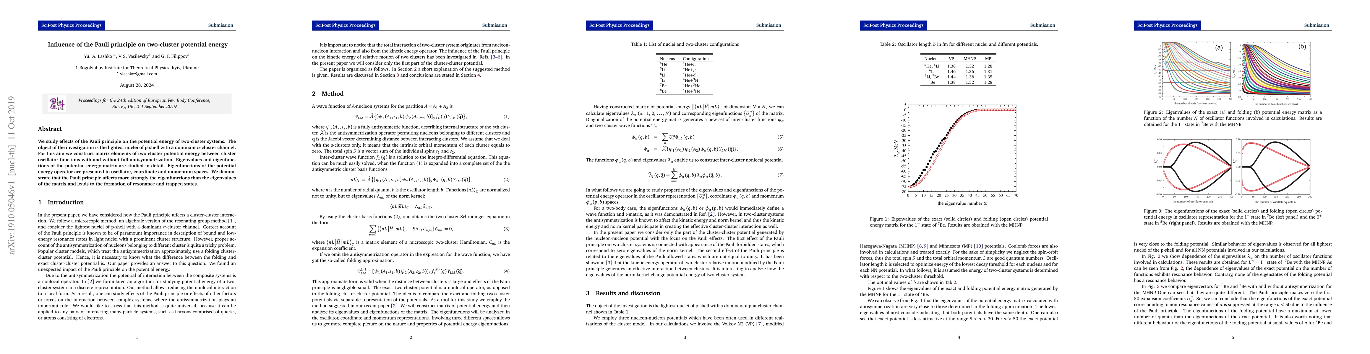 We study effects of the Pauli principle on the potential energy of two-cluster systems. The object of the investigation is the lightest nuclei of p-shell with a dominant $\alpha$-cluster channel. For this aim we construct matrix elements of two-cluster potential energy between cluster oscillator functions with and without full antisymmetrization. Eigenvalues and eigenfunctions of the potential energy matrix are studied in detail. Eigenfunctions of the potential energy operator are presented in oscillator, coordinate and momentum spaces. We demonstrate that the Pauli principle affects more strongly the eigenfunctions than the eigenvalues of the matrix and leads to the formation of resonance and trapped states.