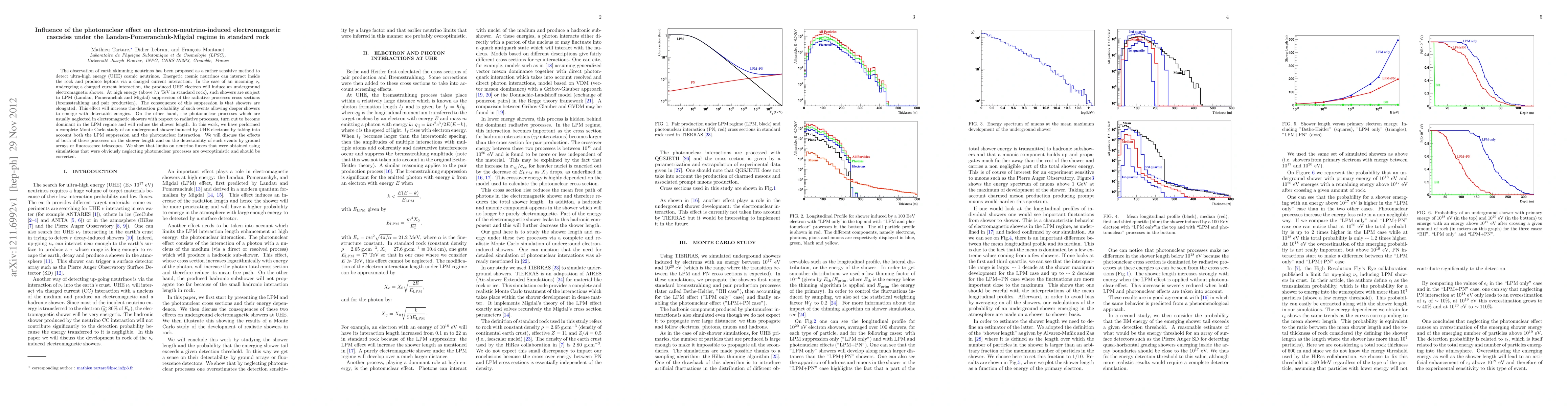The observation of earth skimming neutrinos has been proposed as a rather sensitive method to detect ultra-high energy (UHE) cosmic neutrinos. Energetic cosmic neutrinos can interact inside the rock and produce leptons via a charged current interaction. In the case of an incoming electron neutrino undergoing a charged current interaction, the produced UHE electron will induce an underground electromagnetic shower. At high energy (above 7.7 TeV in standard rock), such showers are subject to LPM (Landau, Pomeranchuk and Migdal) suppression of the radiative processes cross sections (bremsstrahlung and pair production). The consequence of this suppression is that showers are elongated. This effect will increase the detection probability of such events allowing deeper showers to emerge with detectable energies. On the other hand, the photonuclear processes which are usually neglected in electromagnetic showers with respect to radiative processes, turn out to become dominant in the LPM regime and will reduce the shower length. In this work, we have performed a complete Monte Carlo study of an underground shower induced by UHE electrons by taking into account both the LPM suppression and the photonuclear interaction. We will discuss the effects of both of these processes on the shower length and on the detectability of such events by ground arrays or fluorescence telescopes. We show that limits on neutrino fluxes that were obtained using simulations that were obviously neglecting photonuclear processes are overoptimistic and should be corrected.