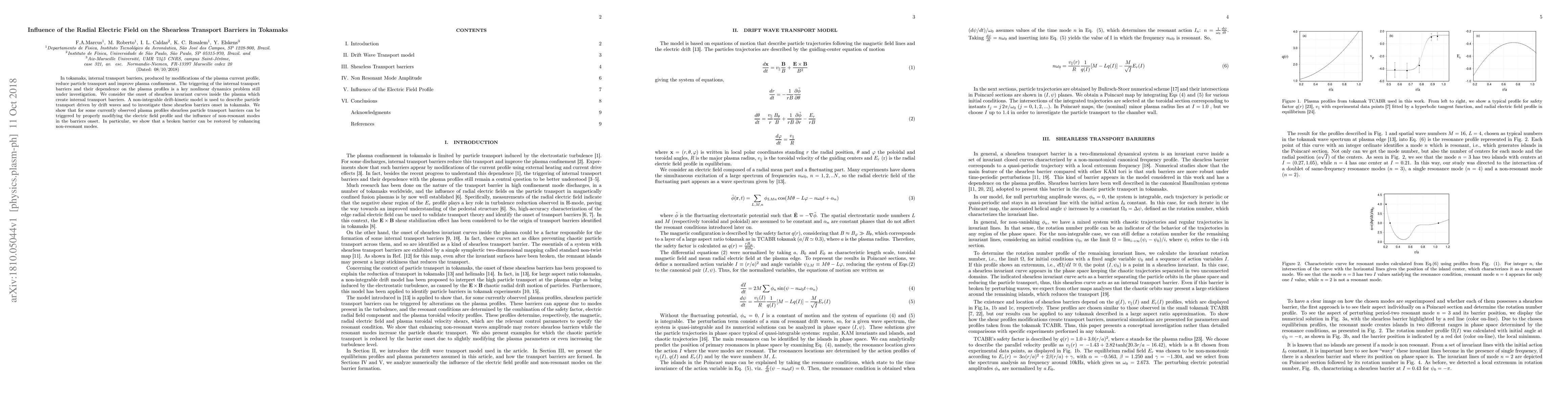 In tokamaks, internal transport barriers, produced by modifications of the plasma current profile, reduce particle transport and improve plasma confinement. The triggering of the internal transport barriers and their dependence on the plasma profiles is a key nonlinear dynamics problem still under investigation. We consider the onset of shearless invariant curves inside the plasma which create internal transport barriers. A non-integrable drift-kinetic model is used to describe particle transport driven by drift waves and to investigate these shearless barriers onset in tokamaks. We show that for some currently observed plasma profiles shearless particle transport barriers can be triggered by properly modifying the electric field profile and the influence of non-resonant modes in the barriers onset. In particular, we show that a broken barrier can be restored by enhancing non-resonant modes.