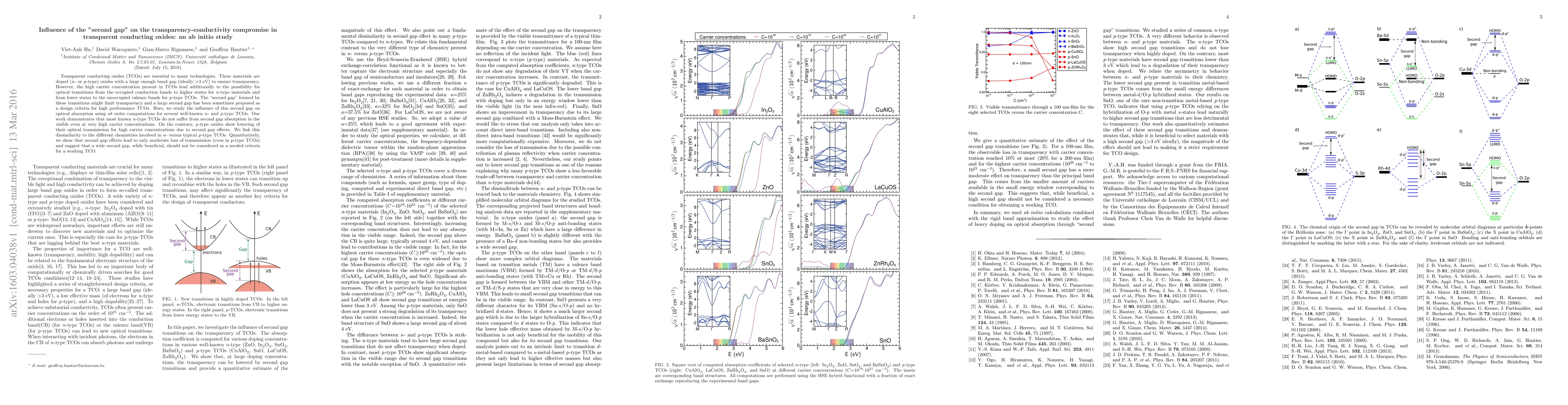 This paper investigates the impact of the "second gap" on the transparency-conductivity trade-off in transparent conducting oxides (TCOs) using ab initio calculations. It finds that while n-type TCOs maintain transparency even at high carrier concentrations, p-type TCOs experience reduced optical transmission due to second gap effects, though the loss is moderate. The study concludes that a wide second gap is not a necessary design criterion for effective TCOs.