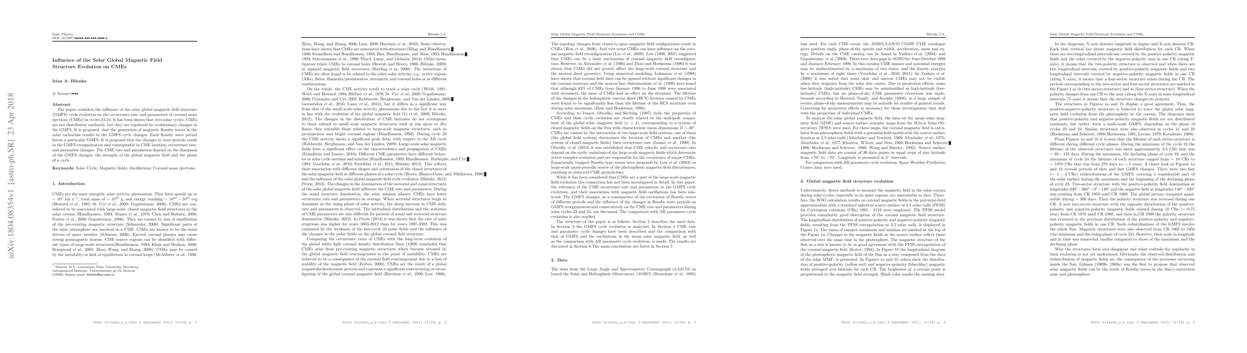 This paper investigates how the evolution of the solar global magnetic field structure (GMFS) influences the occurrence rate and parameters of coronal mass ejections (CMEs) during cycles 23-24. The study finds that CMEs are regulated by changes in the GMFS, driven by magnetic Rossby waves in the solar tachocline, which affect CME location, occurrence rate, and parameters based on the GMFS reorganization.