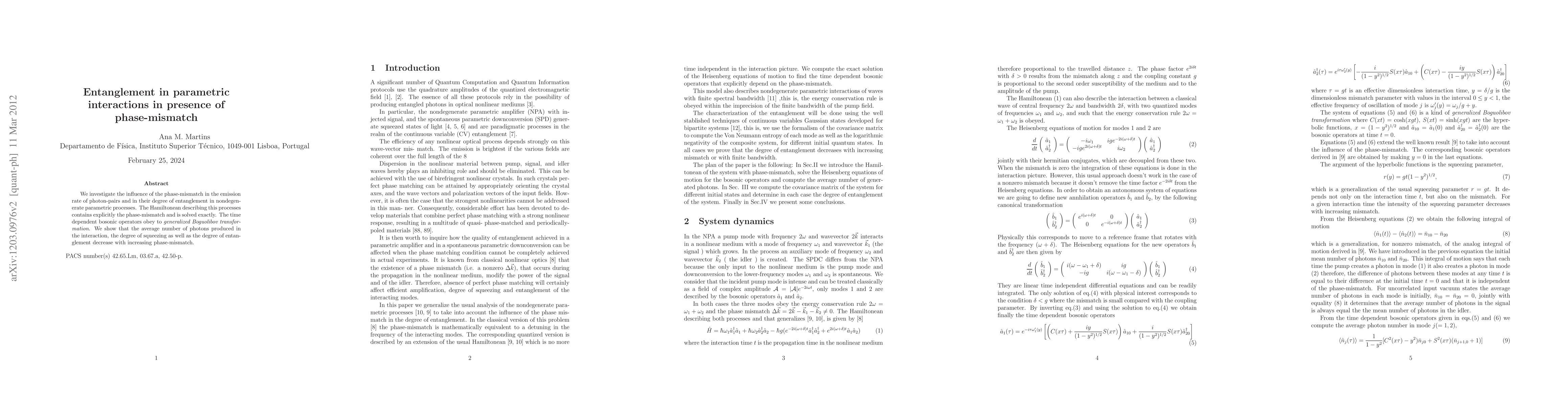 This paper proposes a model for nondegenerate parametric interaction considering the finite spectral bandwidth of the pump wave, demonstrating that the degree of squeezing and entanglement decreases with increasing bandwidth, and computes the average photon number and entanglement levels.