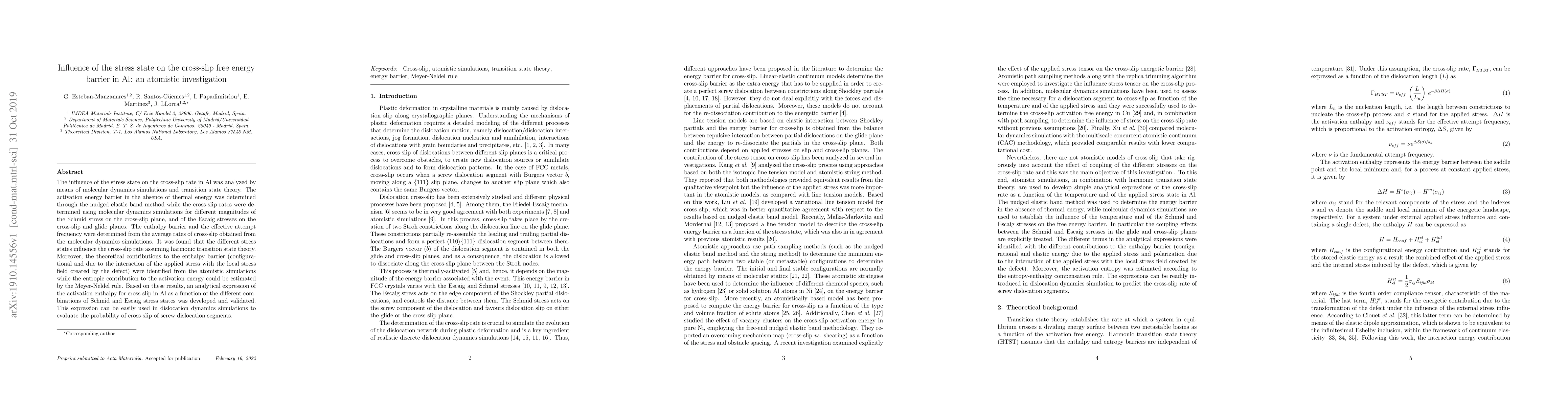 This study uses molecular dynamics simulations to determine how different stress states affect the cross-slip rate in aluminum, revealing that stress influences the activation energy barrier. An analytical expression correlating the activation enthalpy for cross-slip with various stress states was developed and validated for use in dislocation dynamics simulations.