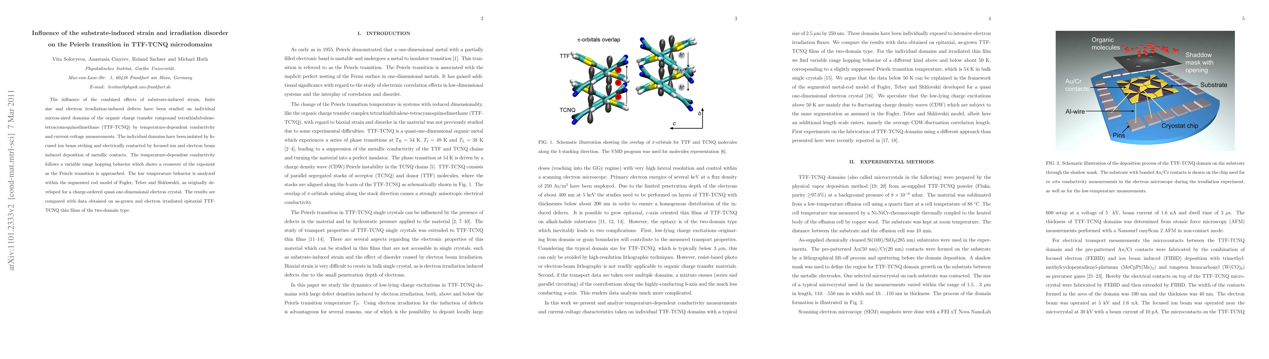 This study investigates the effects of substrate-induced strain and electron irradiation on the Peierls transition in micron-sized TTF-TCNQ microdomains using temperature-dependent conductivity measurements. The findings reveal a crossover in the variable range hopping behavior as the Peierls transition is approached, analyzed via the segmented rod model.