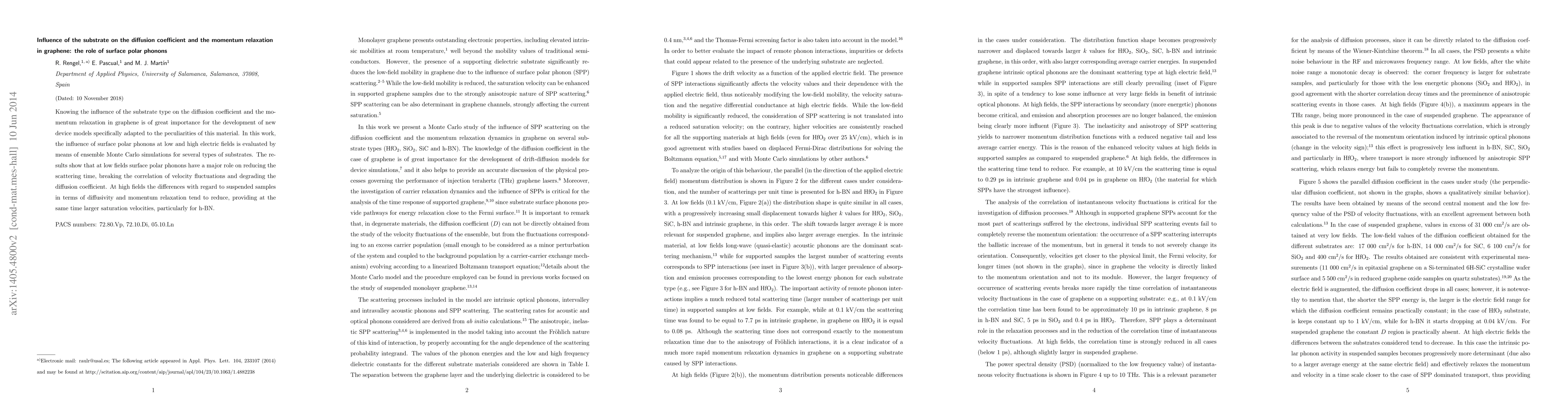 Knowing the influence of the substrate type on the diffusion coefficient and the momentum relaxation in graphene is of great importance for the development of new device models specifically adapted to the peculiarities of this material. In this work, the influence of surface polar phonons at low and high electric fields is evaluated by means of ensemble Monte Carlo simulations for several types of substrates. The results show that at low fields surface polar phonons have a major role on reducing the scattering time, breaking the correlation of velocity fluctuations and degrading the diffusion coefficient. At high fields the differences with regard to suspended samples in terms of diffusivity and momentum relaxation tend to reduce, providing at the same time larger saturation velocities, particularly for h-BN.
