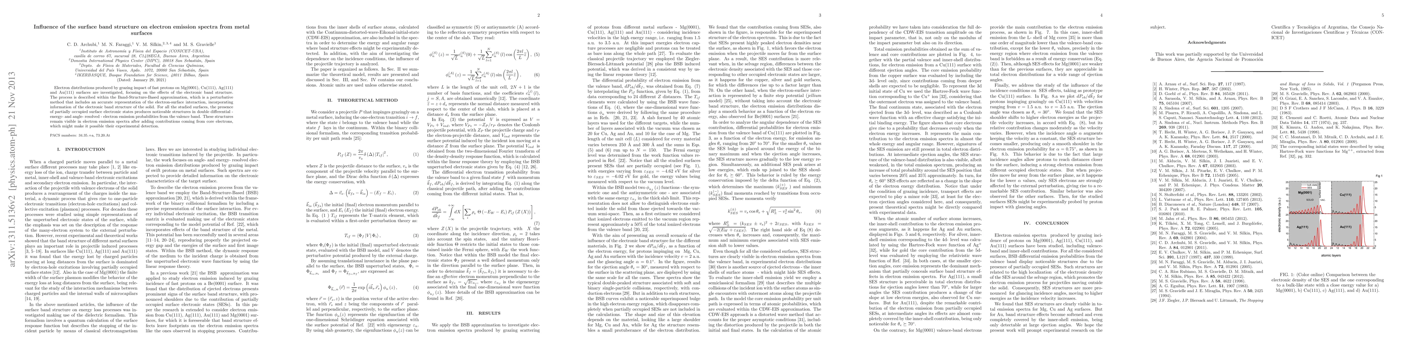 This study investigates electron emission spectra from Mg, Cu, Ag, and Au surfaces under grazing proton impact, revealing the influence of surface electronic band structures. The Band-Structure-Based approximation highlights how partially occupied surface states create distinct structures in the emission probabilities, which persist even with core electron contributions, potentially aiding in experimental detection.