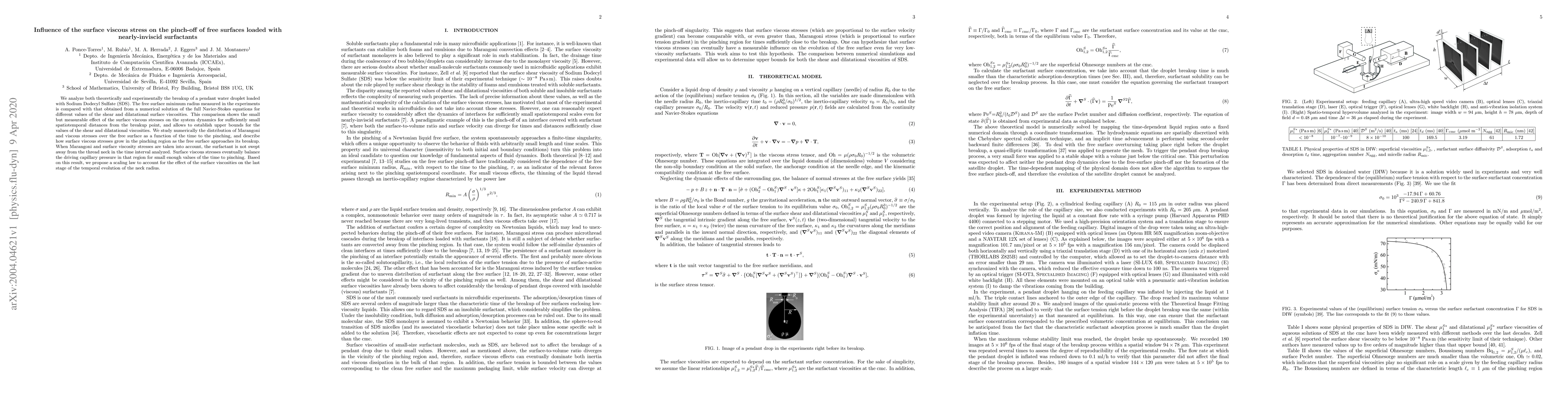 This paper investigates the influence of surface viscous stresses on the breakup of a pendant water droplet containing surfactants, using theoretical and experimental analysis. The study reveals that these stresses have a small but measurable effect on the dynamics near the pinch-off point, leading to the establishment of upper bounds for shear and dilatational viscosities and proposing a scaling law for the neck radius evolution.