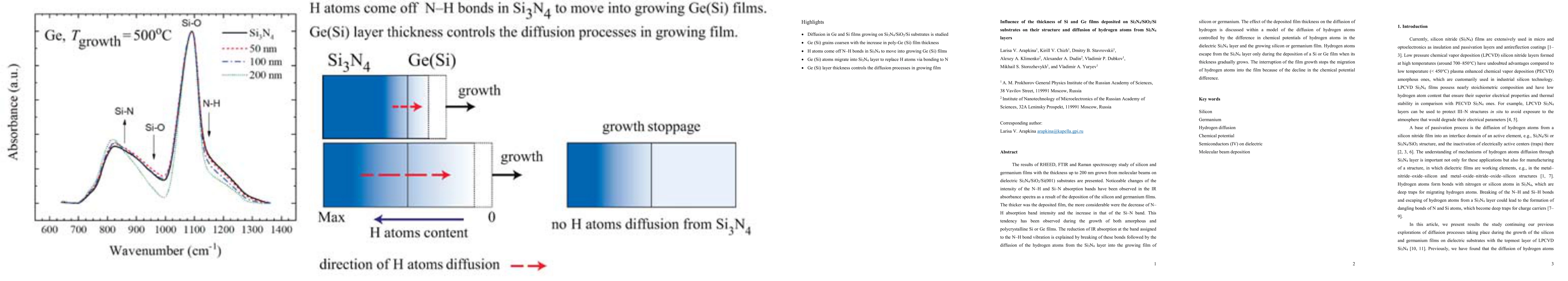 The paper presents a detailed spectroscopic analysis of Si and Ge films on dielectric substrates, proposing a model for hydrogen diffusion controlled by chemical potential differences.