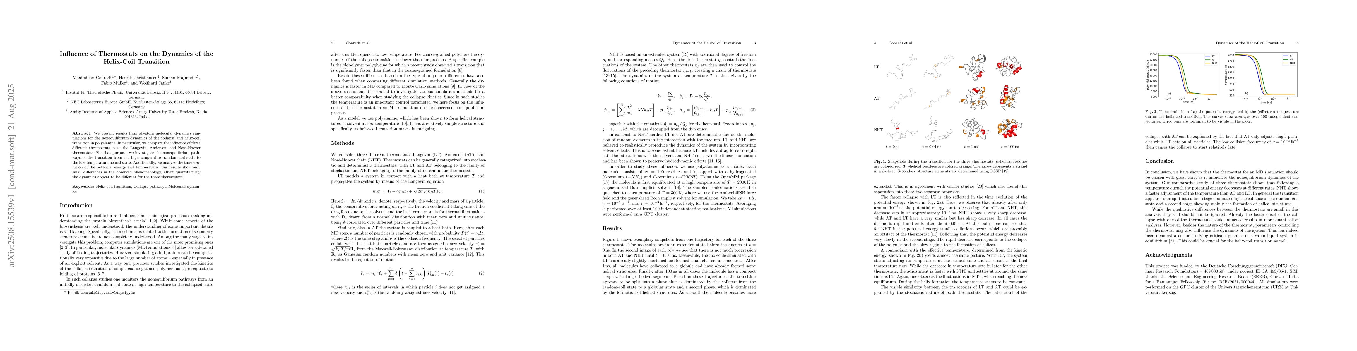 We present results from all-atom molecular dynamics simulations for the nonequilibrium dynamics of the collapse and helix-coil transition in polyalanine. In particular, we compare the influence of three different thermostats, viz., the Langevin, Andersen, and Nos\'e-Hoover thermostats. For that purpose, we investigate the nonequilibrium pathways of the transition from the high-temperature random-coil state to the low-temperature helical state. Additionally, we analyze the time evolution of the potential energy and temperature. Our results show only small differences in the observed phenomenology, albeit quantitatively the dynamics appear to be different for the three thermostats.