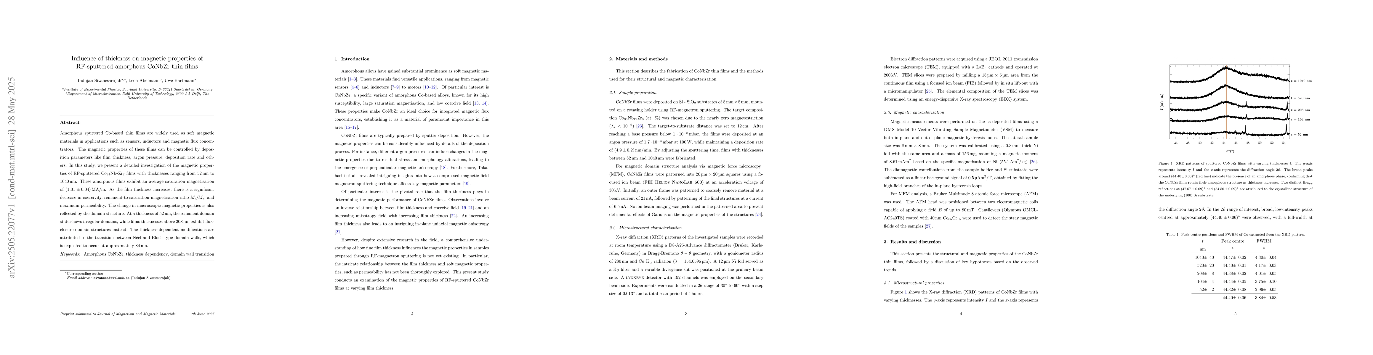 Detailed analysis of thickness-dependent magnetic property modifications in RF-sputtered amorphous Co91Nb7Zr2 thin films, linking changes to domain wall transitions.