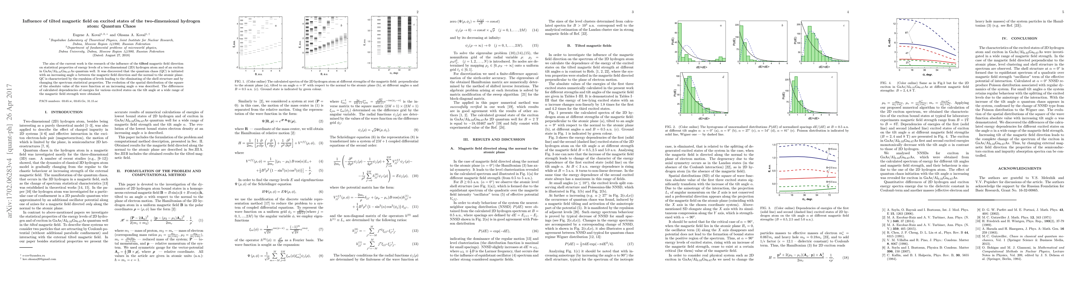 The aim of the current work is the research of the influence of the \textbf{tilted} magnetic field direction on statistical properties of energy levels of a two-dimensional (2D) hydrogen atom and of an exciton in GaAs/Al$_{0.33}$Ga$_{0.67}$As quantum well. It was discovered that the quantum chaos (QC) is initiated with an increasing angle $\alpha$ between the magnetic field direction and the normal to the atomic plane. QC is characterized by the repulsion of levels leading to the eliminating of the shell structure and by changing the spectrum statistical properties. The evolution of the spatial distribution of the square of the absolute value of the wave function at an increasing angle $\alpha$ was described. The differences of calculated dependencies of energies for various excited states on the tilt angle at a wide range of the magnetic field strength were obtained.