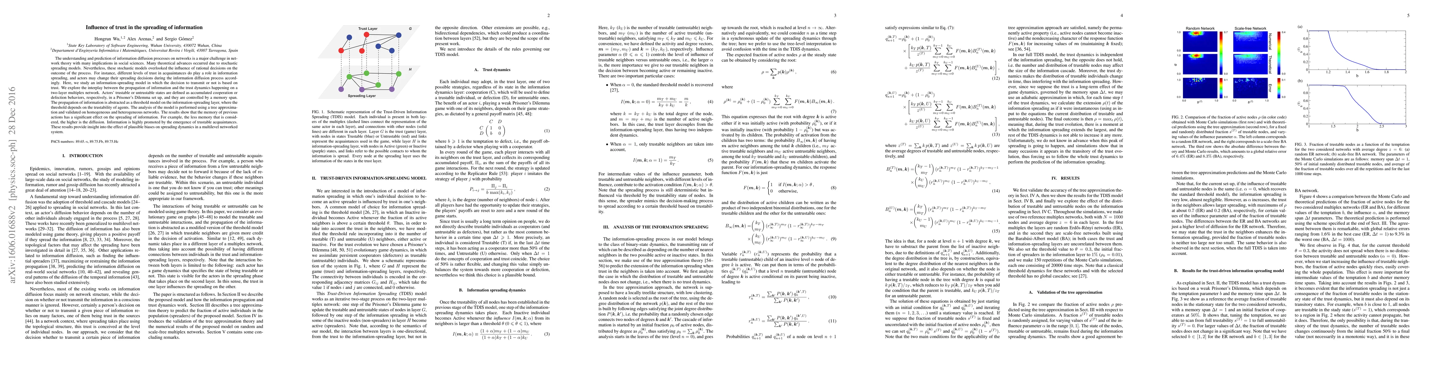 This paper explores an information-spreading model where trust influences transmission decisions, analyzing the interplay between information diffusion and trust dynamics on a two-layer multiplex network. The study finds that memory of past actions significantly affects information spread, with higher diffusion occurring when less memory is considered, and emphasizes the role of trustable acquaintances in promoting information.