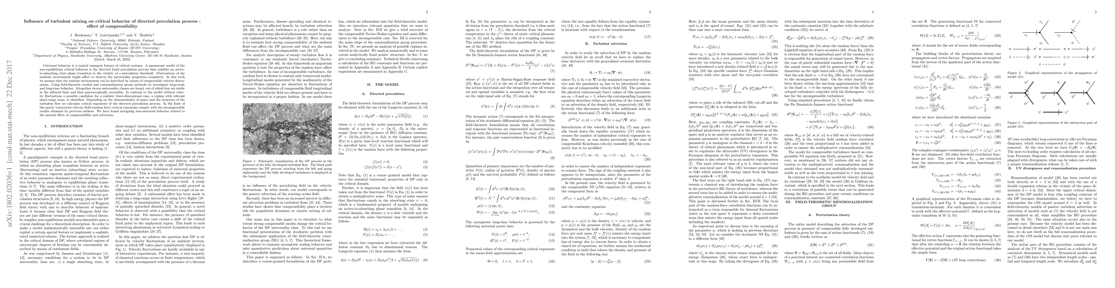 Universal behavior is a typical emergent feature of critical systems. A paramount model of the non-equilibrium critical behavior is the directed bond percolation process that exhibits an active- to-absorbing state phase transition in the vicinity of a percolation threshold. Fluctuations of the ambient environment might affect or destroy the universality properties completely. In this work we assume that the random environment can be described by means of compressible velocity fluctu- ations. Using field-theoretic models and renormalization group methods we investigate large-scale and long-time behavior. Altogether eleven universality classes are found, out of which four are stable in the infrared limit and thus macroscopically accessible. In contrast to the model without veloc- ity fluctuations a possible candidate for a realistic three-dimensional case, a regime with relevant short-range noise, is identified. Depending on the dimensionality of space and the structure of the turbulent flow we calculate critical exponents of the directed percolation process. In the limit of the purely transversal velocity field random force critical exponents comply with the incompressible results obtained by previous authors. We have found intriguing non-universal behavior related to the mutual effect of compressibility and advection.