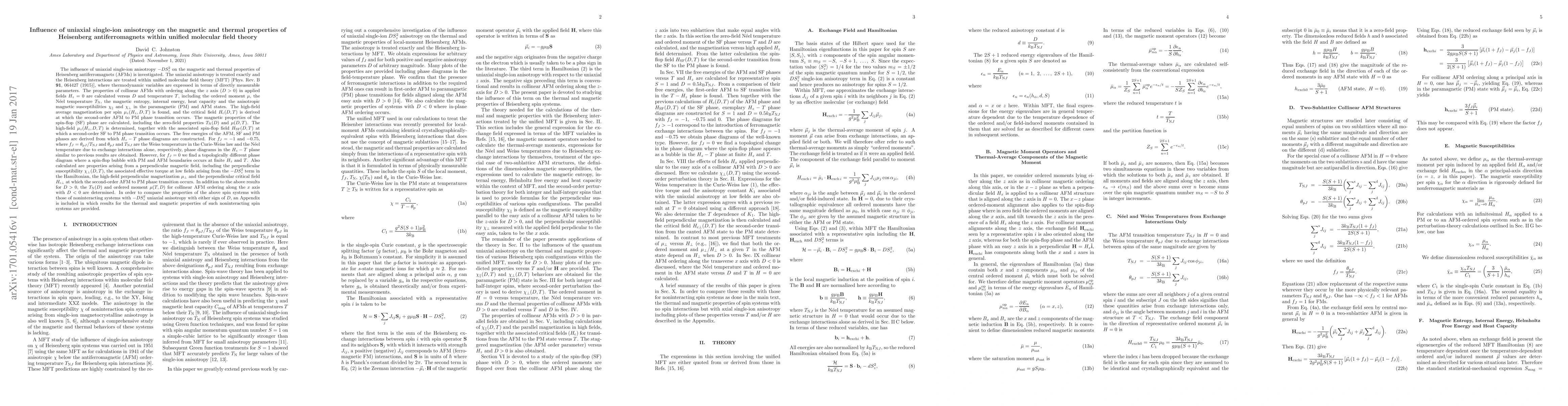 The influence of uniaxial single-ion anisotropy -DSz^2 on the magnetic and thermal properties of Heisenberg antiferromagnets (AFMs) is investigated. The uniaxial anisotropy is treated exactly and the Heisenberg interactions are treated within unified molecular field theory (MFT) [Phys. Rev. B 91, 064427 (1915)], where thermodynamic variables are expressed in terms of directly measurable parameters. The properties of collinear AFMs with ordering along the z axis (D > 0) in applied fields Hz = 0 are calculated versus D and temperature T. The high-field average magnetization per spin muz(Hz,D,T) is found, and the critical field Hc(D,T) is derived at which the second-order AFM to PM phase transition occurs. The magnetic properties of the spin-flop (SF) phase are calculated, including the zero-field properties TN(D) and mu(D,T). The high-field muz(Hz,D,T) is determined, together with the associated spin-flop field HSF(D,T) at which a second-order SF to PM phase transition occurs. The free energies of the AFM, SF and PM phases are derived from which Hz-T phase diagrams are constructed. For a certain combination of parameters we find a topologically distinct phase diagram where a spin-flop bubble occurs at finite Hz and T. Also calculated are properties arising from a perpendicular magnetic field. In addition to the above results for D > 0, some properties with D < 0 are determined. In order to compare the properties of the above spin systems with those of noninteracting systems with DSz^2 uniaxial anisotropy with either sign of D, an Appendix is included in which results for the thermal and magnetic properties of such noninteracting spin systems are provided.