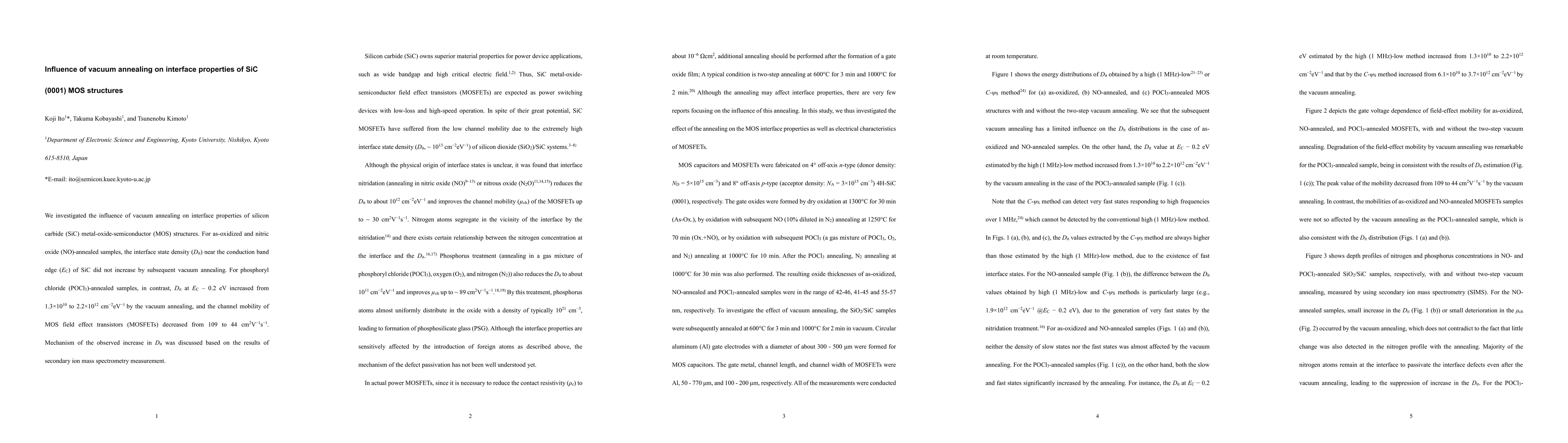 This study examines the effect of vacuum annealing on SiC MOS structures, finding that it does not increase interface state density in as-oxidized and NO-annealed samples but significantly raises it in POCl$_3$-annealed samples, leading to a decrease in MOSFET channel mobility. The increase in interface state density is attributed to specific annealing mechanisms.