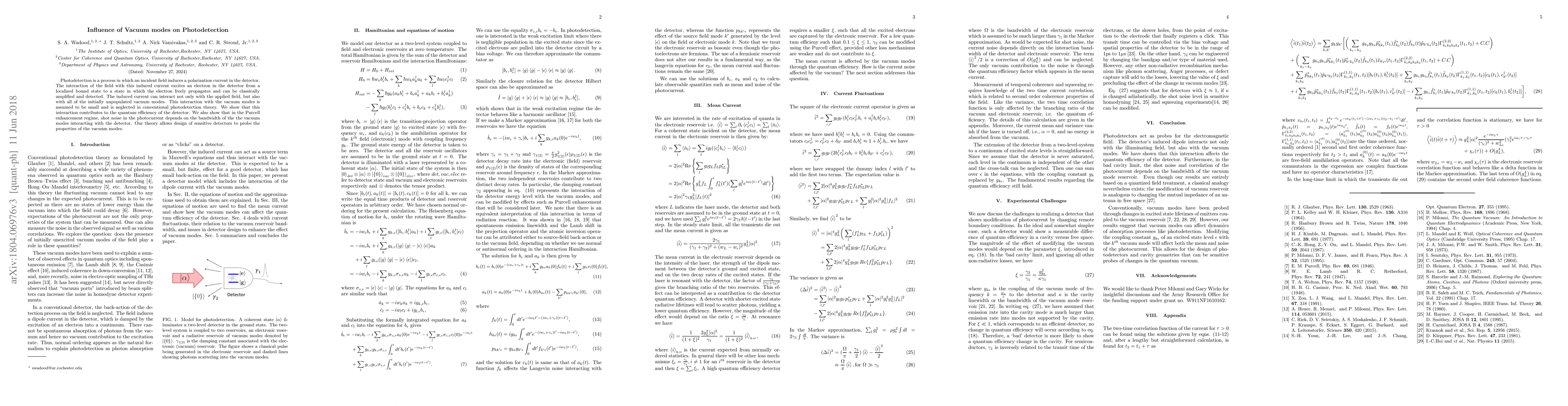 Photodetection is a process in which an incident field induces a polarization current in the detector. The interaction of the field with this induced current excites an electron in the detector from a localized bound state to a state in which the electron freely propagates and can be classically amplified and detected. The induced current can interact not only with the applied field, but also with all of the initially unpopulated vacuum modes. This interaction with the vacuum modes is assumed to be small and is neglected in conventional photodetection theory. We show that this interaction contributes to the quantum efficiency of the detector. We also show that in the Purcell enhancement regime, shot noise in the photocurrent depends on the bandwidth of the the vacuum modes interacting with the detector. Our theory allows design of sensitive detectors to probe the properties of the vacuum modes.