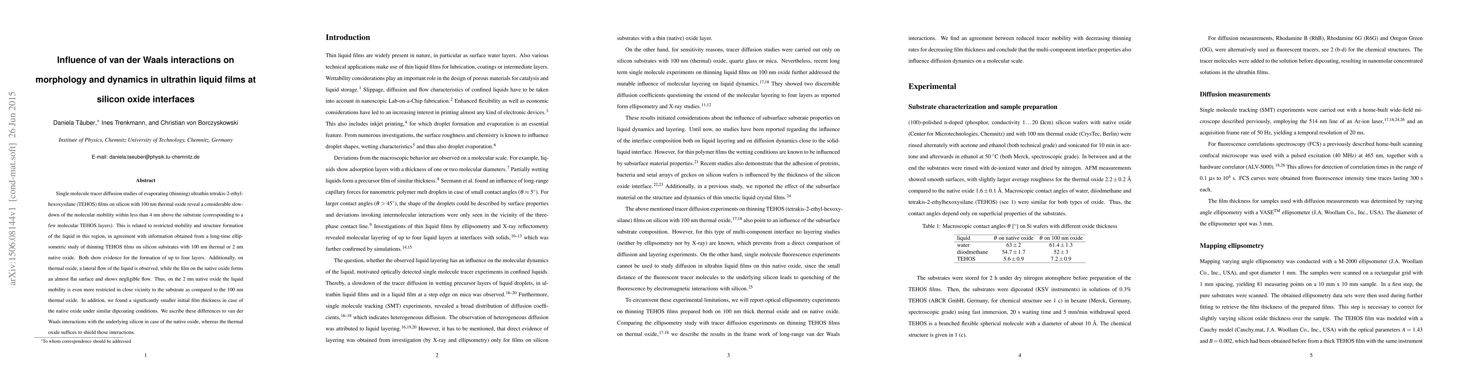 Single molecule tracer diffusion studies of evaporating (thinning) ultrathin tetrakis-2-ethyl-hexoxysilane (TEHOS) films on silicon with 100 nm thermal oxide reveal a considerable slowdown of the molecular mobility within less than 4 nm above the substrate (corresponding to a few molecular TEHOS layers). This is related to restricted mobility and structure formation of the liquid in this region, in agreement with information obtained from a long-time ellipsometric study of thinning TEHOS films on silicon substrates with 100 nm thermal or 2 nm native oxide. Both show evidence for the formation of up to four layers. Additionally, on thermal oxide, a lateral flow of the liquid is observed, while the film on the native oxide forms an almost flat surface and shows negligible flow. Thus, on the 2 nm native oxide the liquid mobility is even more restricted in close vicinity to the substrate as compared to the 100 nm thermal oxide. In addition, we found a significantly smaller initial film thickness in case of the native oxide under similar dipcoating conditions. We ascribe these differences to van der Waals interactions with the underlying silicon in case of the native oxide, whereas the thermal oxide suffices to shield those interactions.