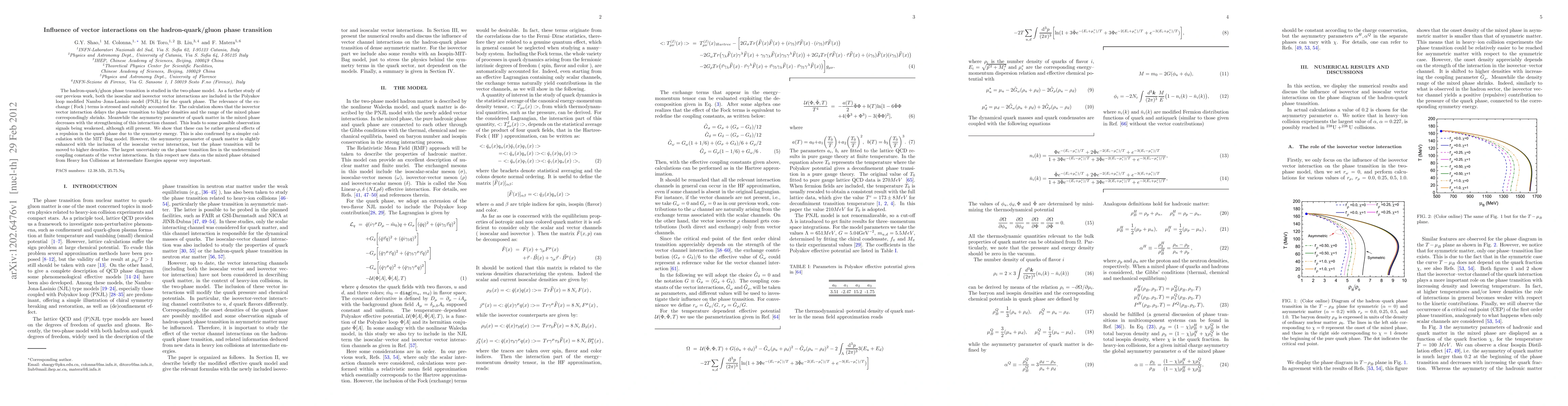 The hadron-quark/gluon phase transition is studied in the two-phase model. As a further study of our previous work, both the isoscalar and isovector vector interactions are included in the Polyakov loop modified Nambu--Jona-Lasinio model (PNJL) for the quark phase. The relevance of the exchange (Fock) terms is stressed and suitably accounted for. The calculation shows that the isovector vector interaction delays the phase transition to higher densities and the range of the mixed phase correspondingly shrinks. Meanwhile the asymmetry parameter of quark matter in the mixed phase decreases with the strengthening of this interaction channel. This leads to some possible observation signals being weakened, although still present. We show that these can be rather general effects of a repulsion in the quark phase due to the symmetry energy. This is also confirmed by a simpler calculation with the MIT--Bag model. However, the asymmetry parameter of quark matter is slightly enhanced with the inclusion of the isoscalar vector interaction, but the phase transition will be moved to higher densities. The largest uncertainty on the phase transition lies in the undetermined coupling constants of the vector interactions. In this respect new data on the mixed phase obtained from Heavy Ion Collisions at Intermediate Energies appear very important.