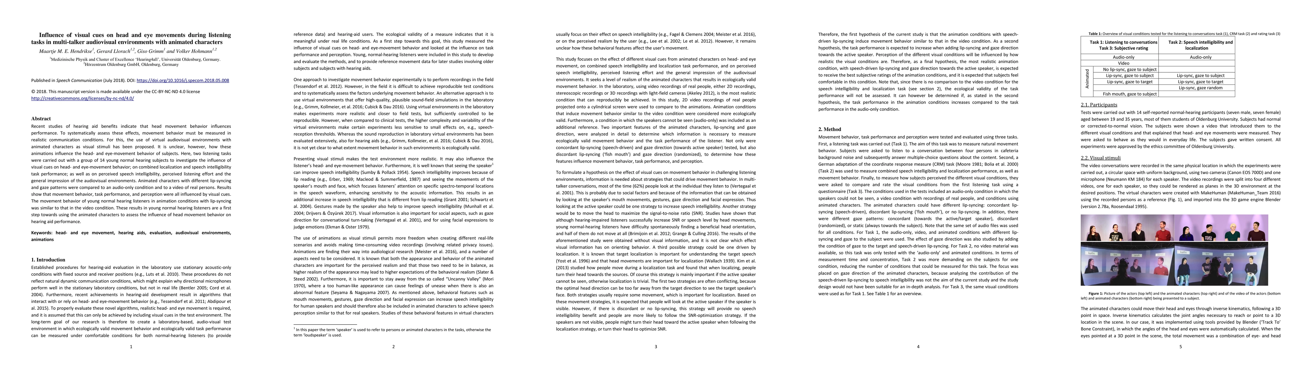 This study investigates how visual cues from animated characters affect head and eye movements, speech intelligibility, and listening effort in multi-talker environments. Results indicate that visual cues significantly influence movement behavior and task performance, suggesting potential for using animated characters to assess hearing aid benefits.