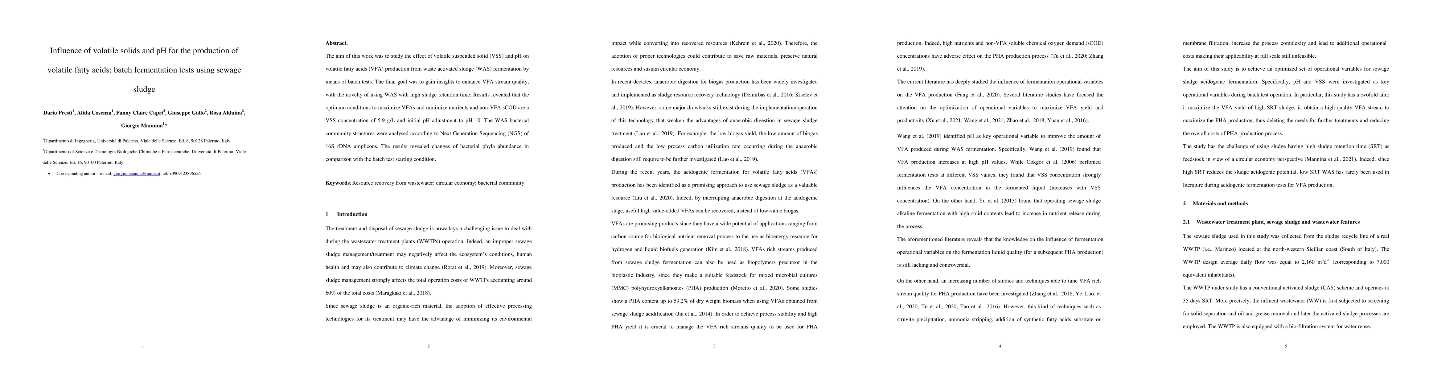 The aim of this work was to study the effect of volatile suspended solid (VSS) and pH on volatile fatty acids (VFA) production from waste activated sludge (WAS) fermentation by means of batch tests. The final goal was to gain insights to enhance VFA stream quality, with the novelty of using WAS with high sludge retention time. Results revealed that the optimum conditions to maximize VFAs and minimize nutrients and non-VFA sCOD are a VSS concentration of 5.9 g/L and initial pH adjustment to pH 10. The WAS bacterial community structures were analysed according to Next Generation Sequencing (NGS) of 16S rDNA amplicons. The results revealed changes of bacterial phyla abundance in comparison with the batch test starting condition.