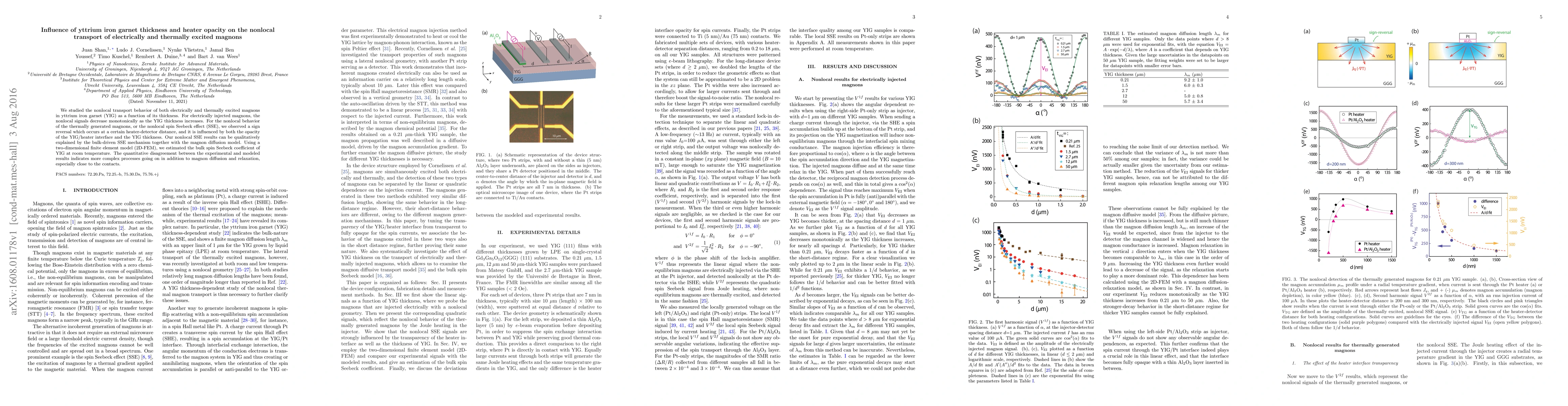This paper investigates the nonlocal transport of magnons in yttrium iron garnet (YIG) concerning its thickness and heater opacity, finding that electrically injected magnons show decreasing nonlocal signals with increasing YIG thickness. For thermally excited magnons, a sign reversal in the nonlocal spin Seebeck effect occurs at a certain distance and is influenced by the YIG/heater interface opacity and thickness, suggesting complex processes beyond simple magnon diffusion.