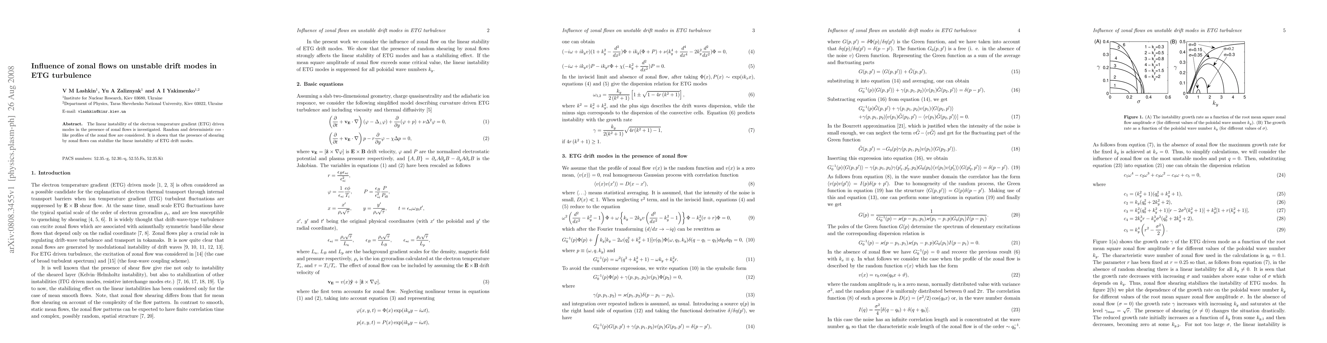 Summary: This study examines the impact of zonal flows on the linear instability of electron temperature gradient (ETG) driven modes, revealing that shearing from zonal flows can stabilize these instabilities, regardless of whether the zonal flow profiles are random or deterministic.