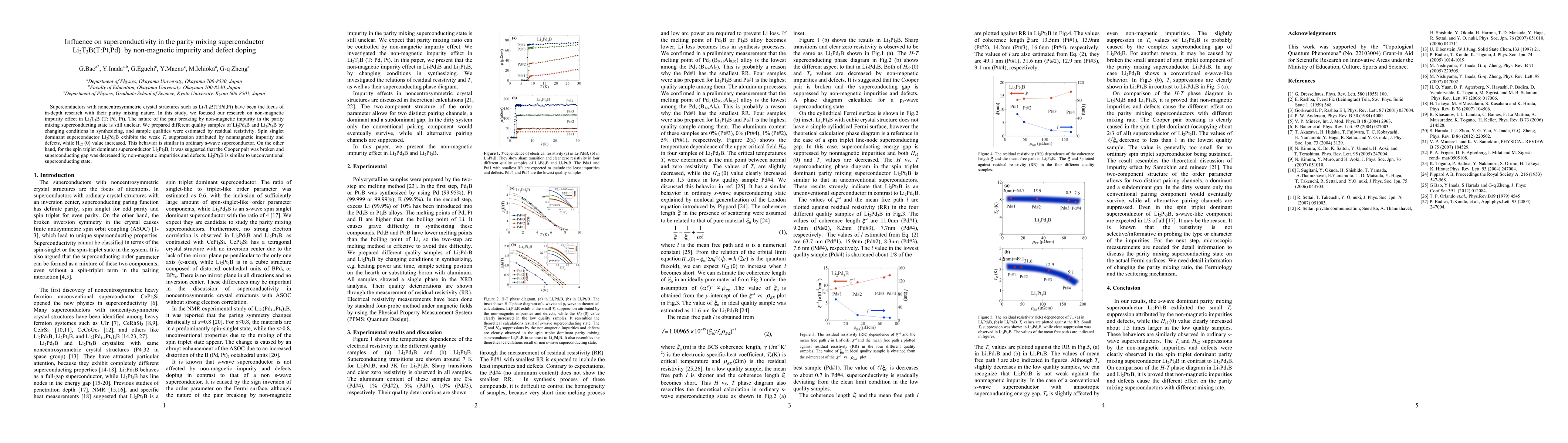 Superconductors with noncentrosymmetric crystal structures such as Li2T3B(T:Pd,Pt) have been the focus of in-depth research with their parity mixing nature. In this study, we focused our research on non-magnetic impurity effect in Li2T3B (T: Pd, Pt). The nature of the pair breaking by non-magnetic impurity in the parity mixing superconducting state is still unclear. We prepared different quality samples of Li2Pd3B and Li2Pt3B by changing conditions in synthesizing, and sample qualities were estimated by residual resistivity. Spin singlet dominant superconductor Li2Pd3B exhibits the weak Tc suppression attributed by nonmagnetic impurity and defects, while Hc2 (0) value increased. This behavior is similar in ordinary s-wave superconductor. On the other hand, for the spin triplet dominant superconductor Li2Pt3B, it was suggested that the Cooper pair was broken and superconducting gap was decreased by non-magnetic impurities and defects. Li2Pt3B is similar to unconventional superconducting state.
