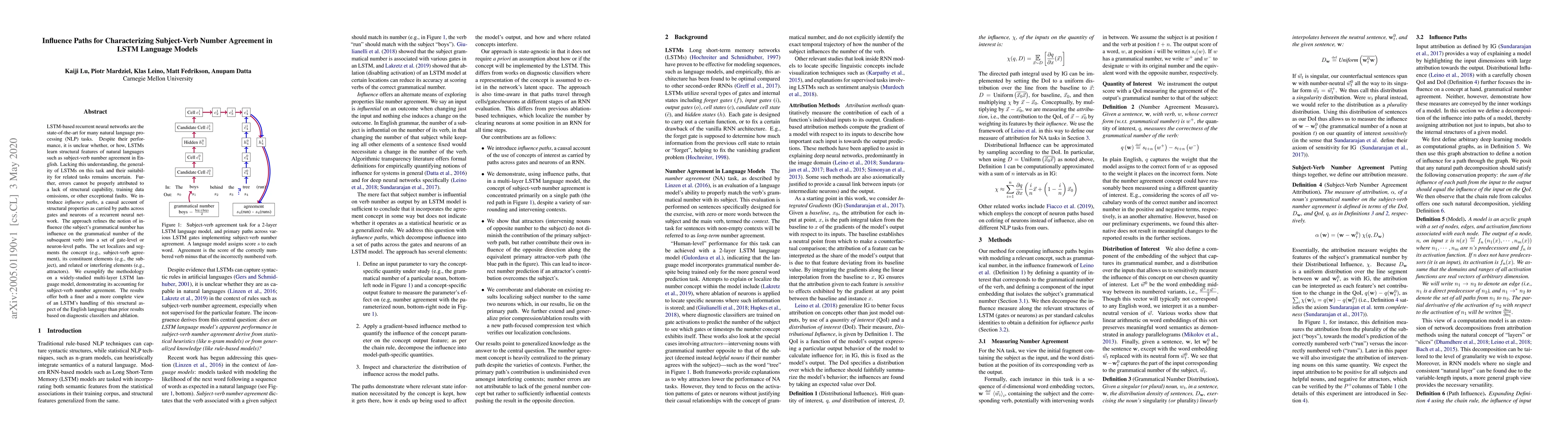 This paper introduces *influence paths* to analyze how LSTMs learn subject-verb number agreement, revealing structural features through gate and neuron-level paths. The methodology provides a more detailed understanding of LSTMs' handling of grammatical agreement compared to previous diagnostic methods.
