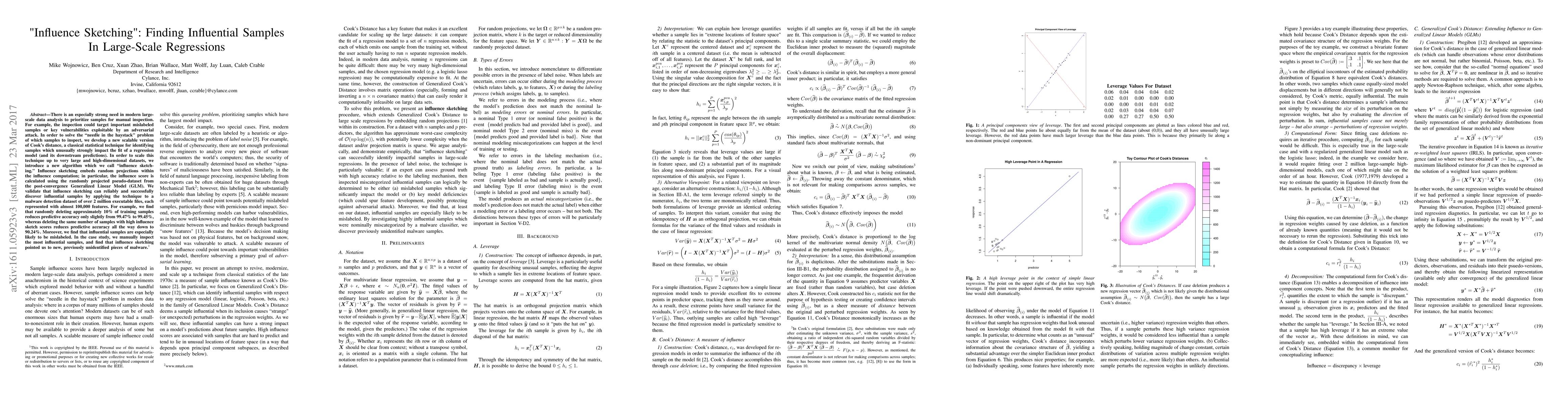 There is an especially strong need in modern large-scale data analysis to prioritize samples for manual inspection. For example, the inspection could target important mislabeled samples or key vulnerabilities exploitable by an adversarial attack. In order to solve the "needle in the haystack" problem of which samples to inspect, we develop a new scalable version of Cook's distance, a classical statistical technique for identifying samples which unusually strongly impact the fit of a regression model (and its downstream predictions). In order to scale this technique up to very large and high-dimensional datasets, we introduce a new algorithm which we call "influence sketching." Influence sketching embeds random projections within the influence computation; in particular, the influence score is calculated using the randomly projected pseudo-dataset from the post-convergence Generalized Linear Model (GLM). We validate that influence sketching can reliably and successfully discover influential samples by applying the technique to a malware detection dataset of over 2 million executable files, each represented with almost 100,000 features. For example, we find that randomly deleting approximately 10% of training samples reduces predictive accuracy only slightly from 99.47% to 99.45%, whereas deleting the same number of samples with high influence sketch scores reduces predictive accuracy all the way down to 90.24%. Moreover, we find that influential samples are especially likely to be mislabeled. In the case study, we manually inspect the most influential samples, and find that influence sketching pointed us to new, previously unidentified pieces of malware.