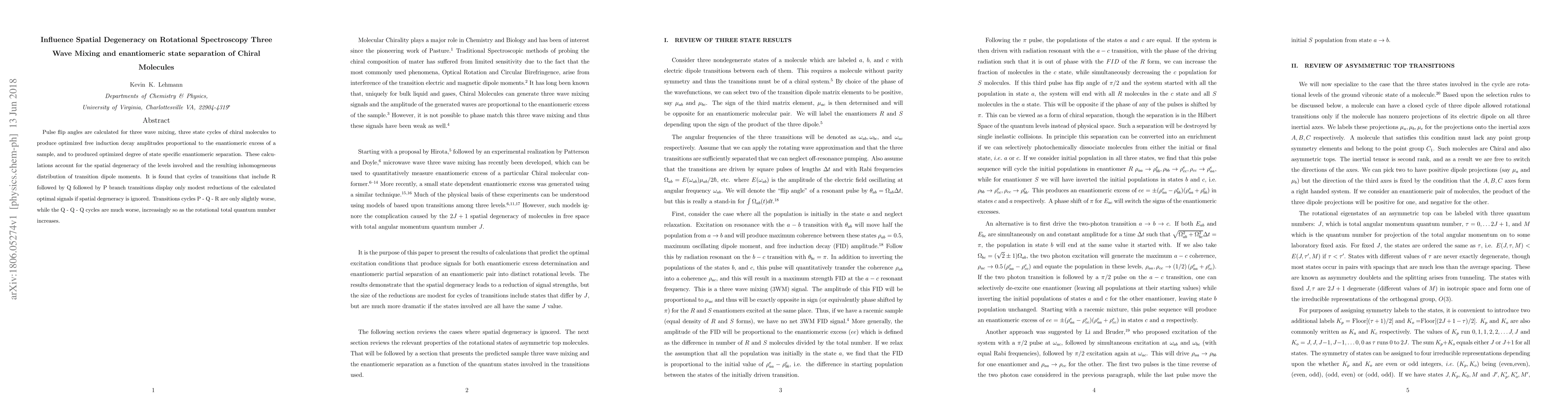 Pulse flip angles are calculated for three wave mixing, three state cycles of chiral molecules to produce optimized free induction decay amplitudes proportional to the enantiomeric excess of a sample, and to produced optimized degree of state specific enantiomeric separation. These calculations account for the spatial degeneracy of the levels involved and the resulting inhomogeneous distribution of transition dipole moments. It is found that cycles of transitions that include R followed by Q followed by P branch transitions display only modest reductions of the calculated optimal signals if spatial degeneracy is ignored. Transitions cycles P - Q - R are only slightly worse, while the Q - Q - Q cycles are much worse, increasingly so as the rotational total quantum number increases.