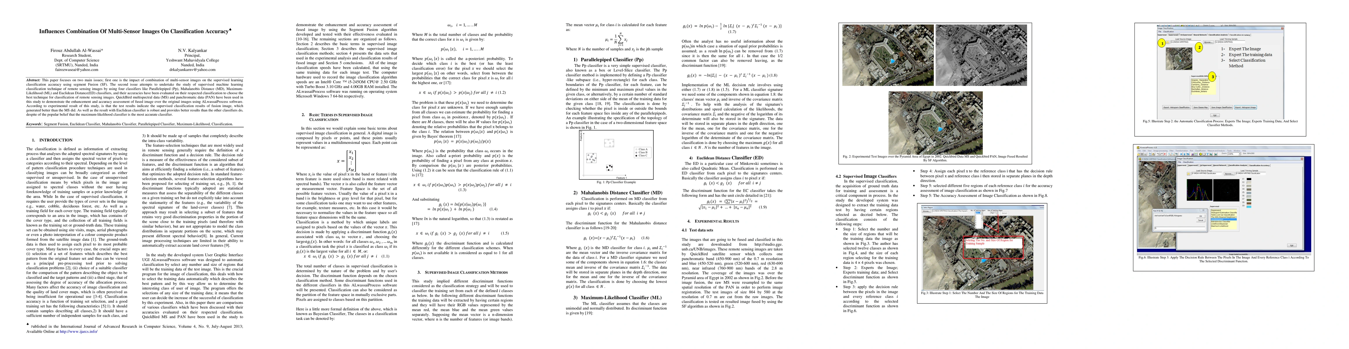This study evaluates the impact of combining multi-sensor images on supervised classification using segment fusion, finding that fused images outperform original multispectral data. The Euclidean Distance classifier was identified as the most accurate among the tested classifiers, challenging the conventional preference for the Maximum-Likelihood classifier.