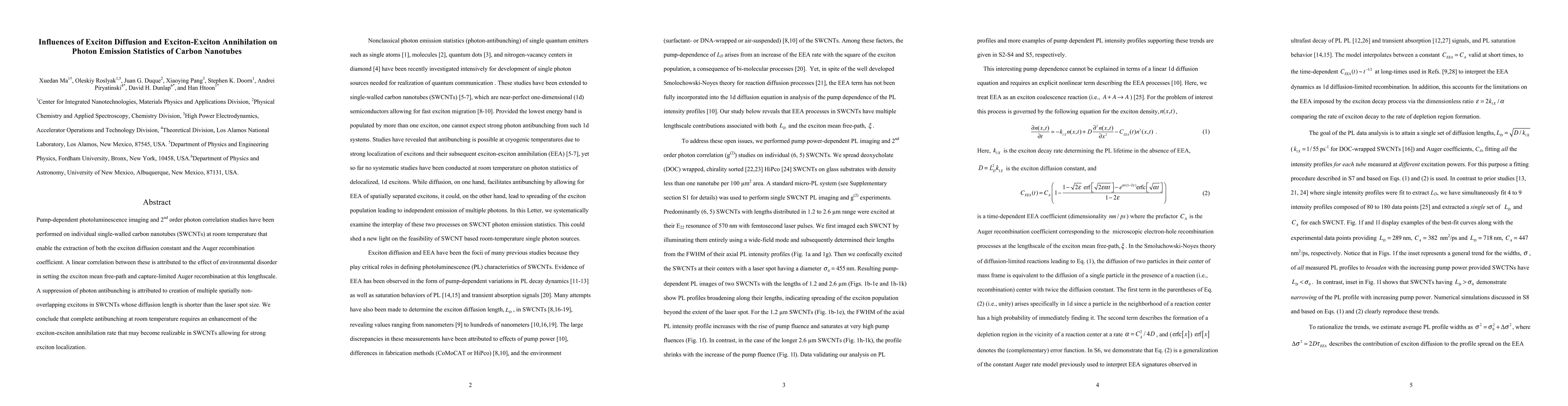 Summary: Research investigates exciton diffusion and exciton-exciton annihilation effects on photon emission from carbon nanotubes, revealing that environmental disorder influences exciton dynamics. Multiple excitons suppress photon antibunching, suggesting stronger exciton localization could enhance annihilation rates at room temperature.