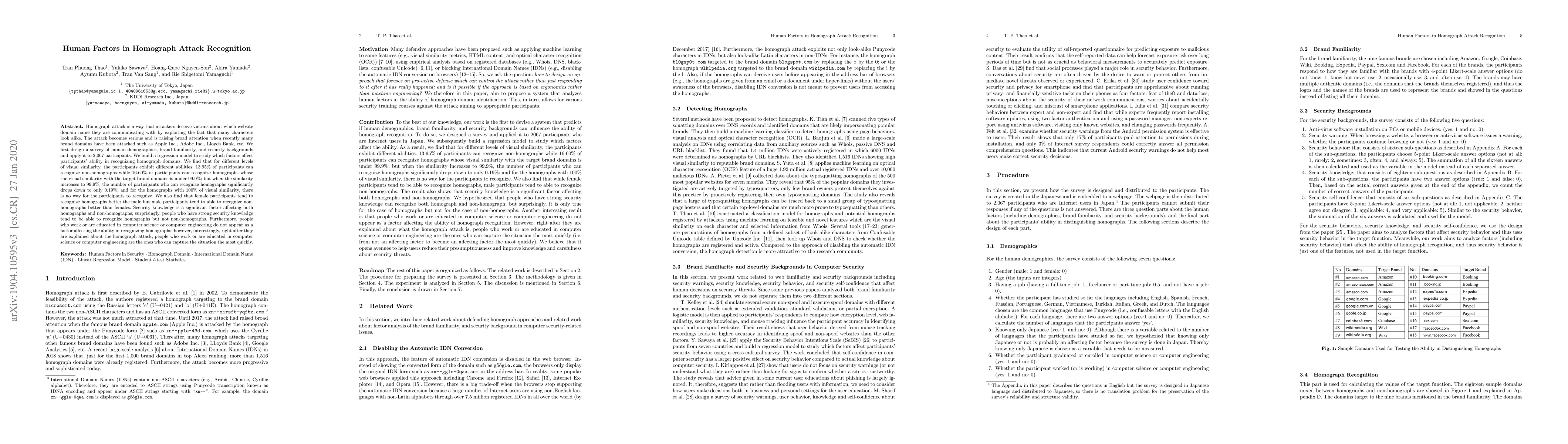 Homograph attack is a way that attackers deceive victims about which website domain name they are communicating with by exploiting the fact that many characters look alike. The attack becomes serious and is raising broad attention when recently many brand domains have been attacked such as Apple Inc., Adobe Inc., Lloyds Bank, etc. We first design a survey of human demographics, brand familiarity, and security backgrounds and apply it to 2,067 participants. We build a regression model to study which factors affect participants' ability in recognizing homograph domains. We find that for different levels of visual similarity, the participants exhibit different abilities. 13.95% of participants can recognize non-homographs while 16.60% of participants can recognize homographs whose the visual similarity with the target brand domains is under 99.9%; but when the similarity increases to 99.9%, the number of participants who can recognize homographs significantly drops down to only 0.19%; and for the homographs with 100% of visual similarity, there is no way for the participants to recognize. We also find that female participants tend to recognize homographs better the male but male participants tend to able to recognize non-homographs better than females. Security knowledge is a significant factor affecting both homographs and non-homographs; surprisingly, people who have strong security knowledge tend to be able to recognize homographs but not non-homographs. Furthermore, people who work or are educated in computer science or computer engineering do not appear as a factor affecting the ability in recognizing homographs; however, interestingly, right after they are explained about the homograph attack, people who work or are educated in computer science or computer engineering are the ones who can capture the situation the most quickly.