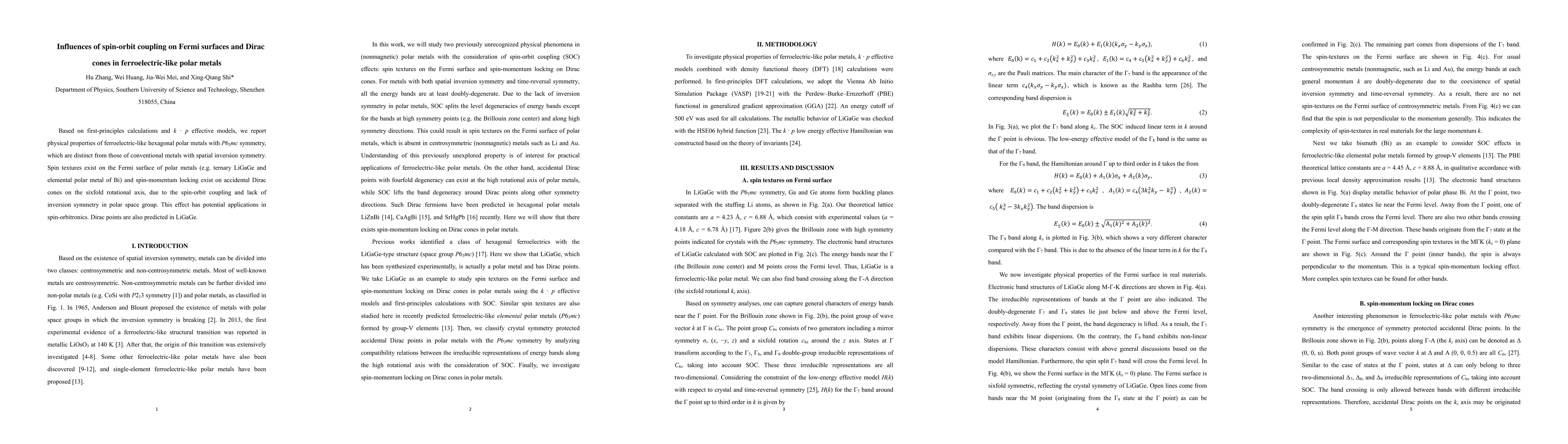 Summary: This study reveals that spin-orbit coupling and the absence of spatial inversion symmetry in ferroelectric-like hexagonal polar metals create unique spin textures on the Fermi surface and spin-momentum locking on accidental Dirac cones, with potential implications for spin-orbitronics technologies.