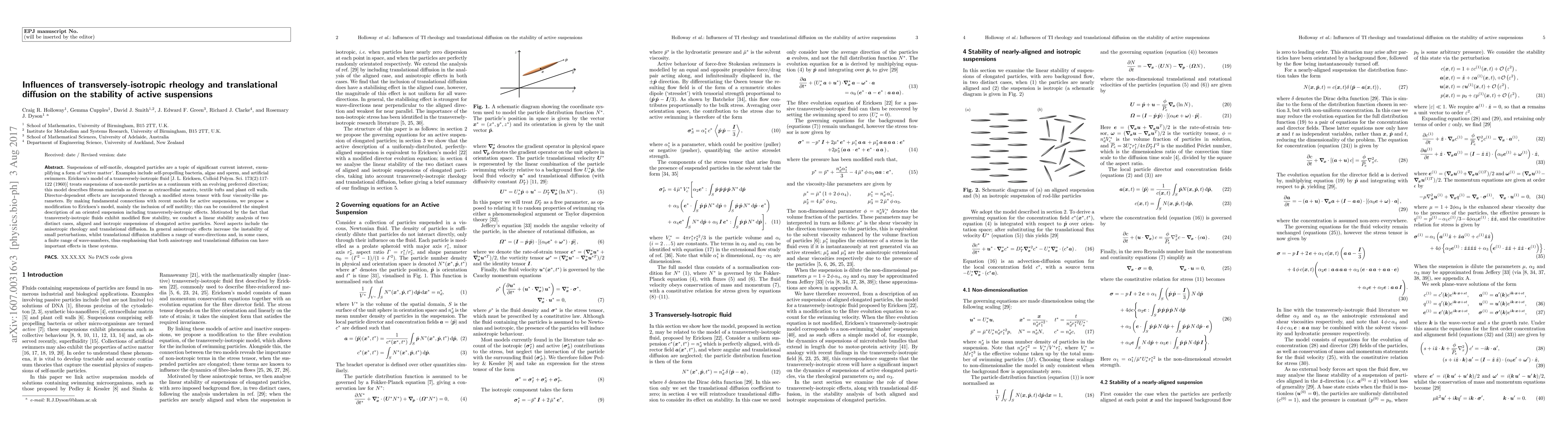 This paper investigates the stability of active suspensions of self-motile, elongated particles using a modified Ericksen model that incorporates transversely-isotropic rheology and translational diffusion. It finds that anisotropic rheology generally increases instability, while diffusion can stabilize certain wave-directions and wave-numbers.