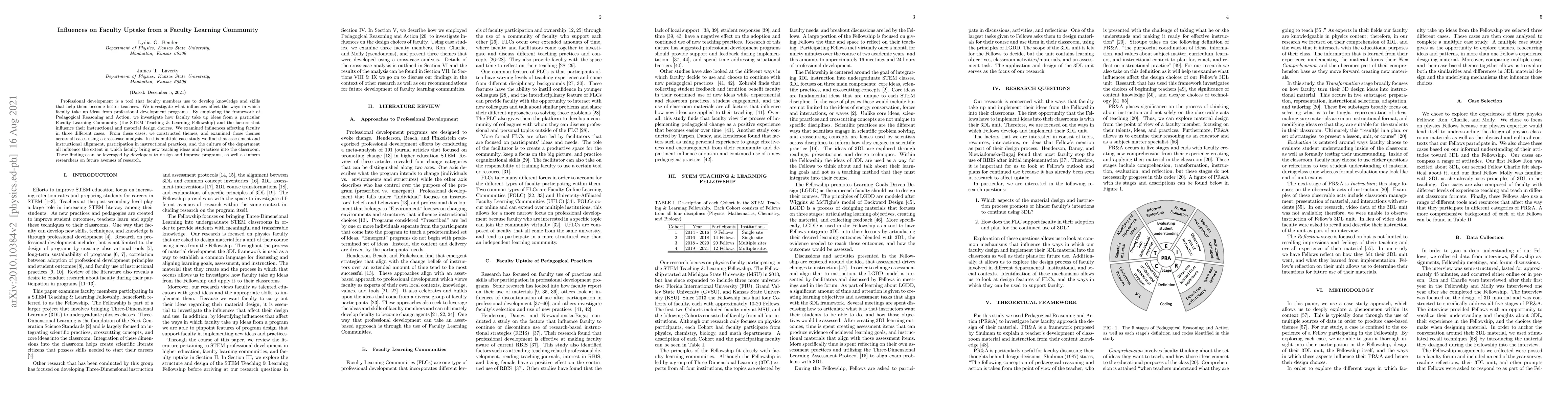 This study explores factors influencing faculty uptake of ideas from a Faculty Learning Community, specifically the STEM Teaching & Learning Fellowship, using a Pedagogical Reasoning and Action framework. Key influences identified include assessment and instructional alignment, participation in instructional practices, and departmental culture.