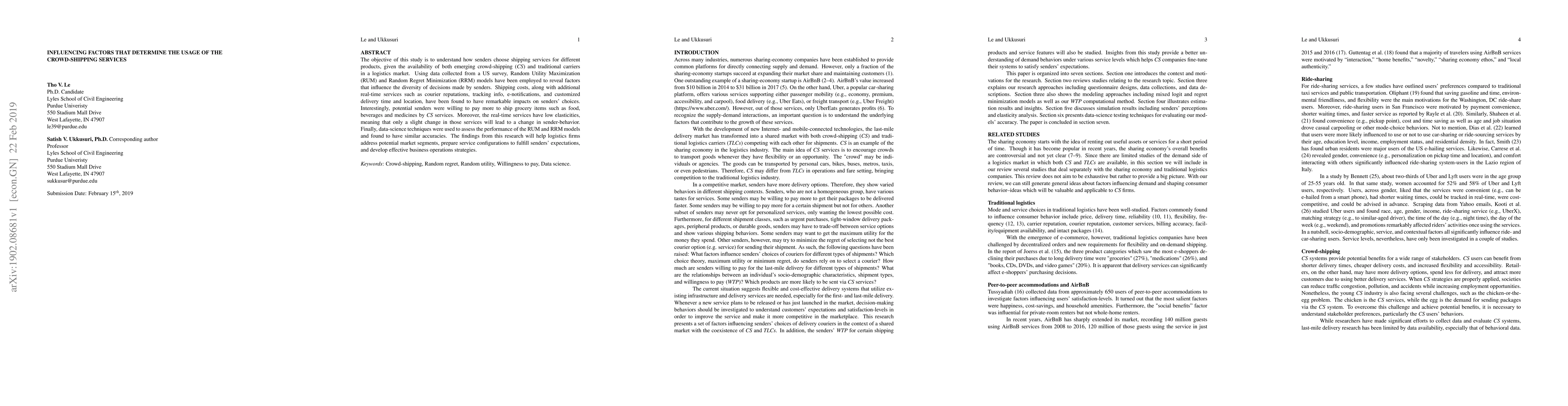The objective of this study is to understand how senders choose shipping services for different products, given the availability of both emerging crowd-shipping (CS) and traditional carriers in a logistics market. Using data collected from a US survey, Random Utility Maximization (RUM) and Random Regret Minimization (RRM) models have been employed to reveal factors that influence the diversity of decisions made by senders. Shipping costs, along with additional real-time services such as courier reputations, tracking info, e-notifications, and customized delivery time and location, have been found to have remarkable impacts on senders' choices. Interestingly, potential senders were willing to pay more to ship grocery items such as food, beverages, and medicines by CS services. Moreover, the real-time services have low elasticities, meaning that only a slight change in those services will lead to a change in sender-behavior. Finally, data-science techniques were used to assess the performance of the RUM and RRM models and found to have similar accuracies. The findings from this research will help logistics firms address potential market segments, prepare service configurations to fulfill senders' expectations, and develop effective business operations strategies.