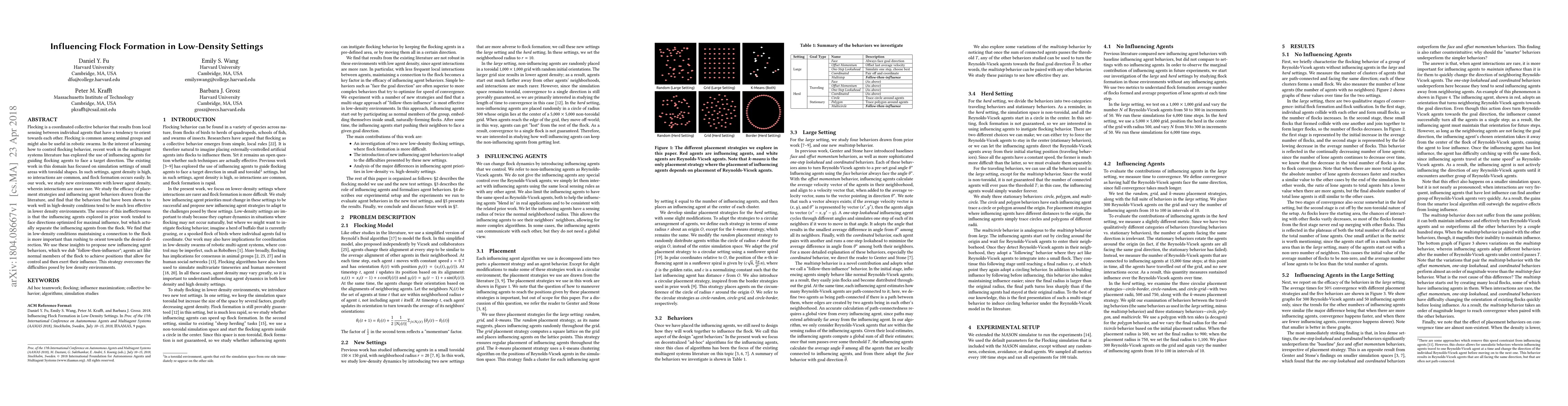 Flocking is a coordinated collective behavior that results from local sensing between individual agents that have a tendency to orient towards each other. Flocking is common among animal groups and might also be useful in robotic swarms. In the interest of learning how to control flocking behavior, recent work in the multiagent systems literature has explored the use of influencing agents for guiding flocking agents to face a target direction. The existing work in this domain has focused on simulation settings of small areas with toroidal shapes. In such settings, agent density is high, so interactions are common, and flock formation occurs easily. In our work, we study new environments with lower agent density, wherein interactions are more rare. We study the efficacy of placement strategies and influencing agent behaviors drawn from the literature, and find that the behaviors that have been shown to work well in high-density conditions tend to be much less effective in lower density environments. The source of this ineffectiveness is that the influencing agents explored in prior work tended to face directions optimized for maximal influence, but which actually separate the influencing agents from the flock. We find that in low-density conditions maintaining a connection to the flock is more important than rushing to orient towards the desired direction. We use these insights to propose new influencing agent behaviors, which we dub "follow-then-influence"; agents act like normal members of the flock to achieve positions that allow for control and then exert their influence. This strategy overcomes the difficulties posed by low density environments.