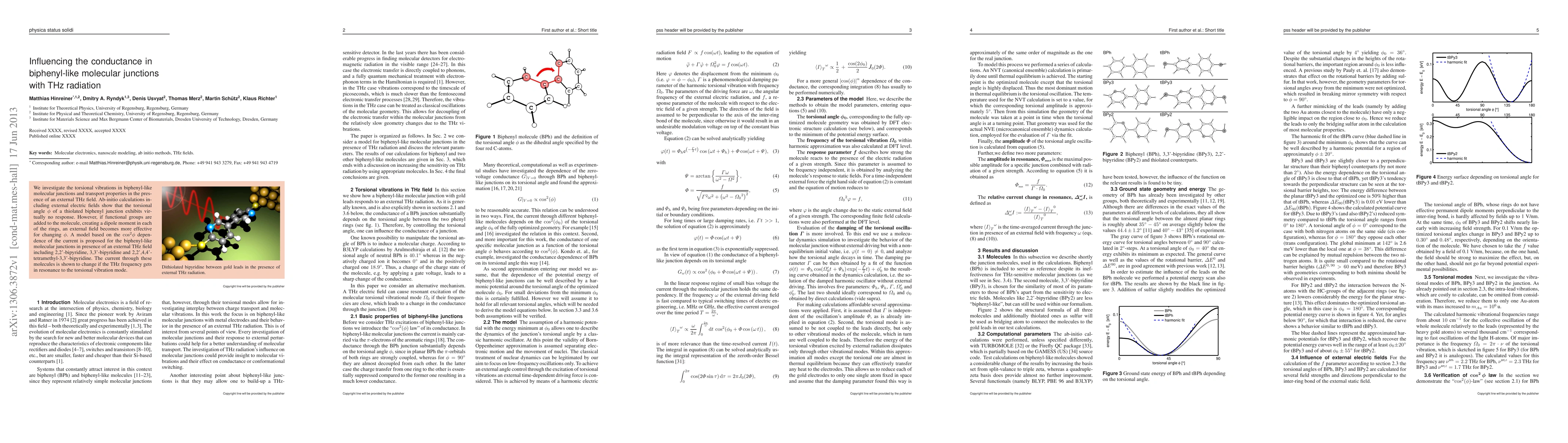 We investigate the torsional vibrations in biphenyl-like molecular junctions and transport properties in the presence of an external THz field. Ab-initio calculations including external electric fields show that the torsional angle {\phi} of a thiolated biphenyl junction exhibits virtually no response. However, if functional groups are added to the molecule, creating a dipole moment in each of the rings, an external field becomes more effective for changing {\phi}. A model based on the cos2{\phi} dependence of the current is proposed for the biphenyl-like molecular junctions in presence of an external THz field including 2,2'-bipyridine, 3,3'-bipyridine and 2,2',4,4'- tetramethyl-3,3'-bipyridine. The current through these molecules is shown to change if the THz frequency gets in resonance to the torsional vibration mode.