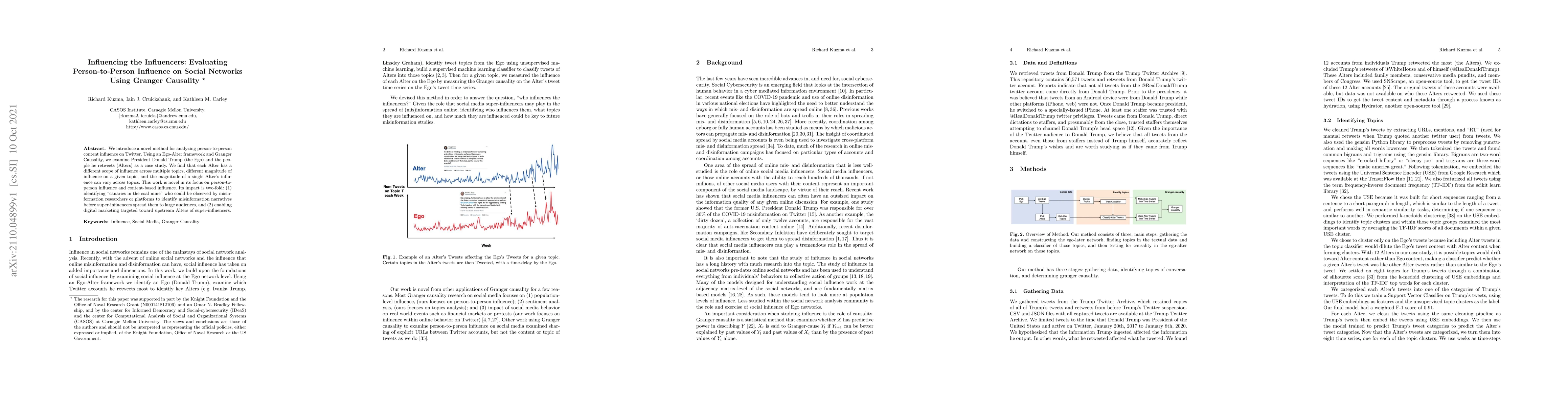 We introduce a novel method for analyzing person-to-person content influence on Twitter. Using an Ego-Alter framework and Granger Causality, we examine President Donald Trump (the Ego) and the people he retweets (Alters) as a case study. We find that each Alter has a different scope of influence across multiple topics, different magnitude of influence on a given topic, and the magnitude of a single Alter's influence can vary across topics. This work is novel in its focus on person-to-person influence and content-based influence. Its impact is two-fold: (1) identifying "canaries in the coal mine" who could be observed by misinformation researchers or platforms to identify misinformation narratives before super-influencers spread them to large audiences, and (2) enabling digital marketing targeted toward upstream Alters of super-influencers.