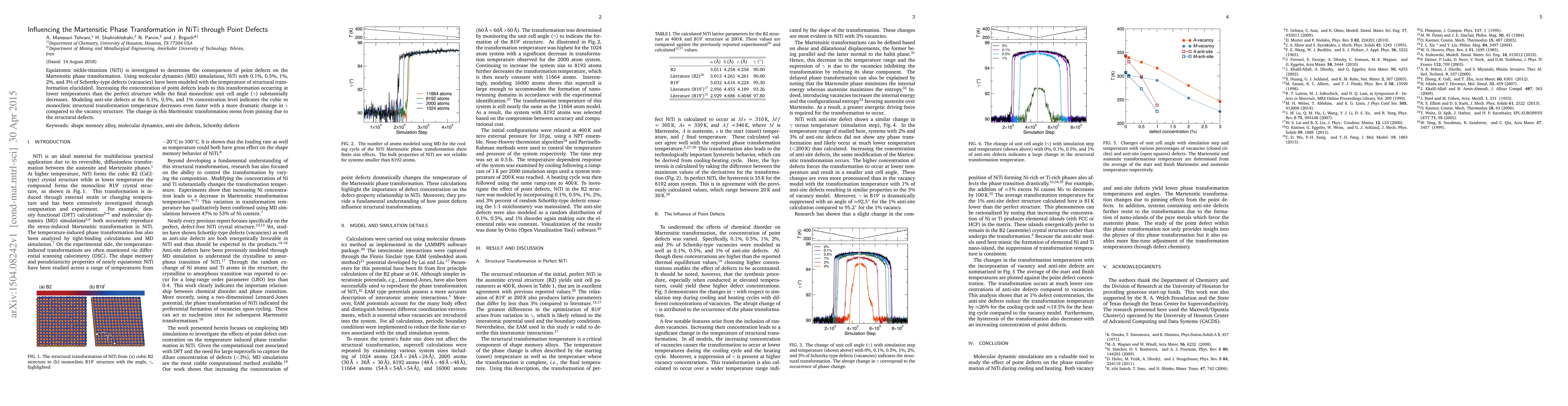 This study uses molecular dynamics simulations to explore how point defects, particularly Schottky-type vacancies and anti-site defects, influence the martensitic phase transformation in NiTi. Increasing defect concentration lowers the transformation temperature and decreases the final monoclinic unit cell angle, with anti-site defects having a more pronounced effect.