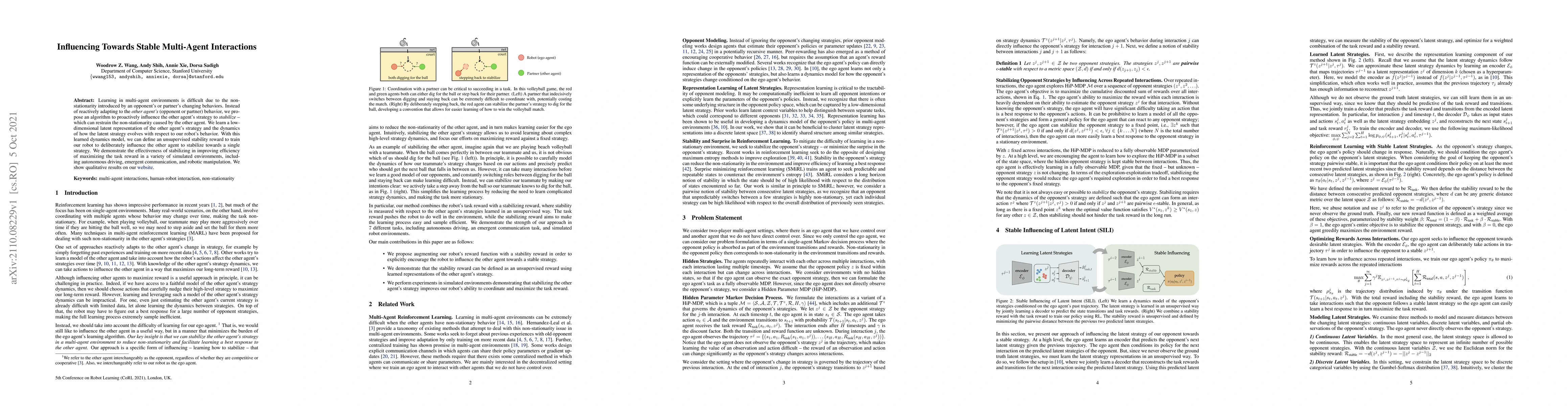Learning in multi-agent environments is difficult due to the non-stationarity introduced by an opponent's or partner's changing behaviors. Instead of reactively adapting to the other agent's (opponent or partner) behavior, we propose an algorithm to proactively influence the other agent's strategy to stabilize -- which can restrain the non-stationarity caused by the other agent. We learn a low-dimensional latent representation of the other agent's strategy and the dynamics of how the latent strategy evolves with respect to our robot's behavior. With this learned dynamics model, we can define an unsupervised stability reward to train our robot to deliberately influence the other agent to stabilize towards a single strategy. We demonstrate the effectiveness of stabilizing in improving efficiency of maximizing the task reward in a variety of simulated environments, including autonomous driving, emergent communication, and robotic manipulation. We show qualitative results on our website: https://sites.google.com/view/stable-marl/.